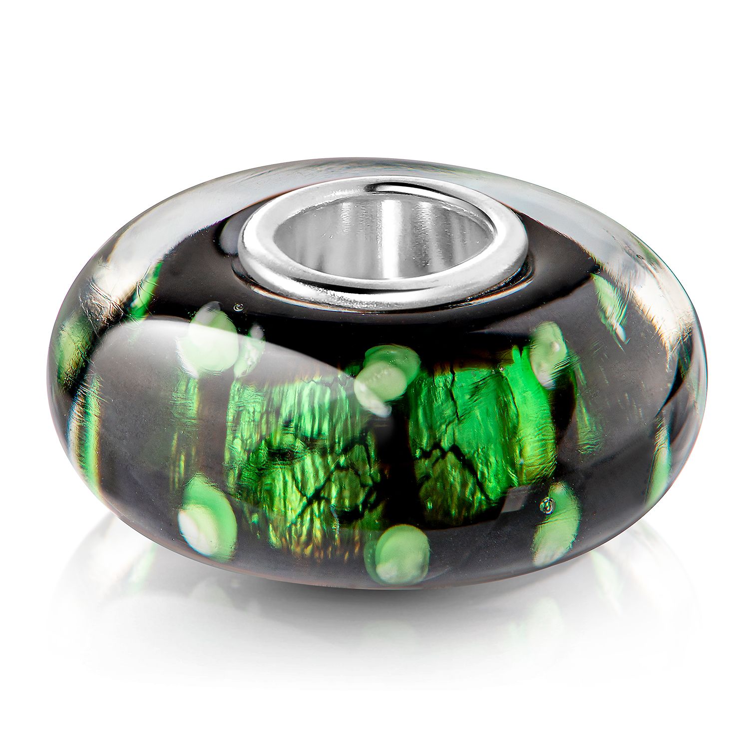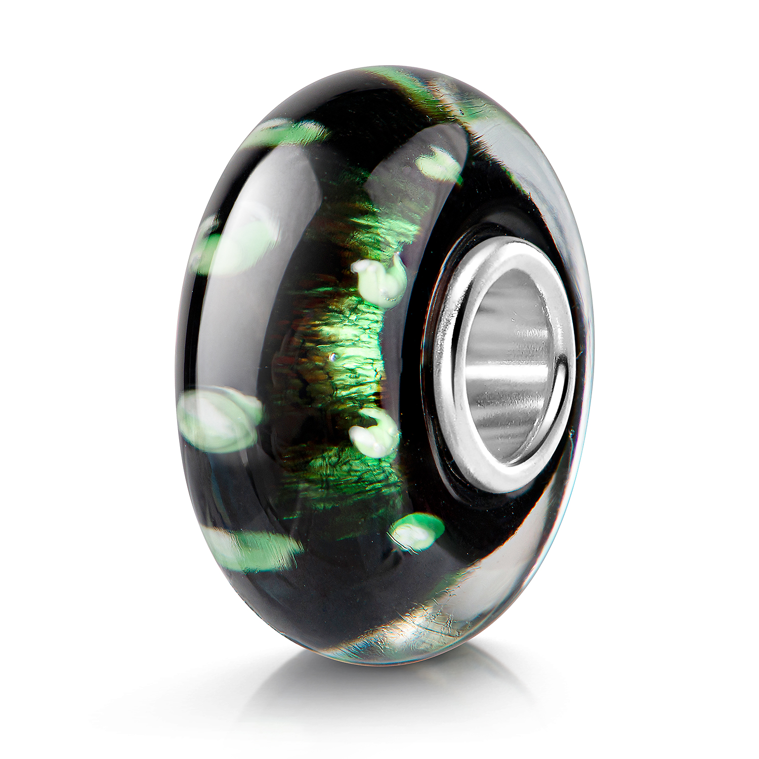 Schwarzer Glas Bead mit grün schimmernder Glitzerfolie im Glasinneren, ausgestattet mit einer 925 Sterling Silber Hülse. Auslieferung inkl. Materia Satin Schmuckbeutel.