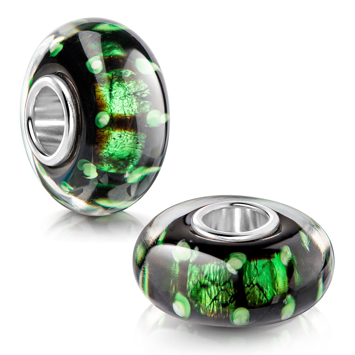 Dieser schwarz-grüne Glas Bead mit Glitzerfolie im Glasinneren erzeugt einen besonderen Schimmer an ihrem Armband. Das Glas Bead Element ist mit einer Hülse aus massivem 925 Sterling Silber ausgestattet. Dieser Bead ist passend zu allen gängigen Beads Armbändern/ Ketten mit einem max. Durchmesser von 4,4mm. Somit ist er auch kompatibel zu allen bekannten Bead-Marken.