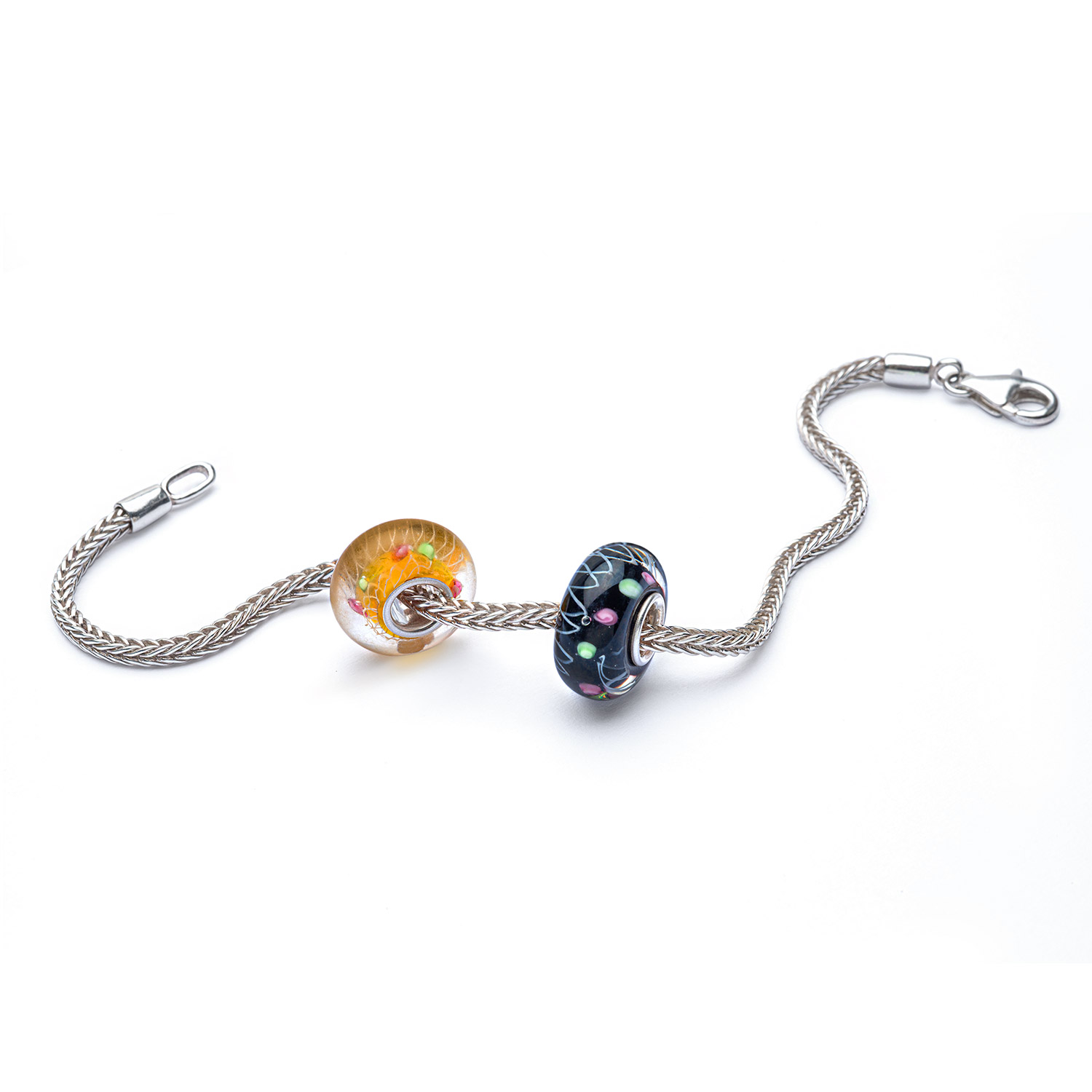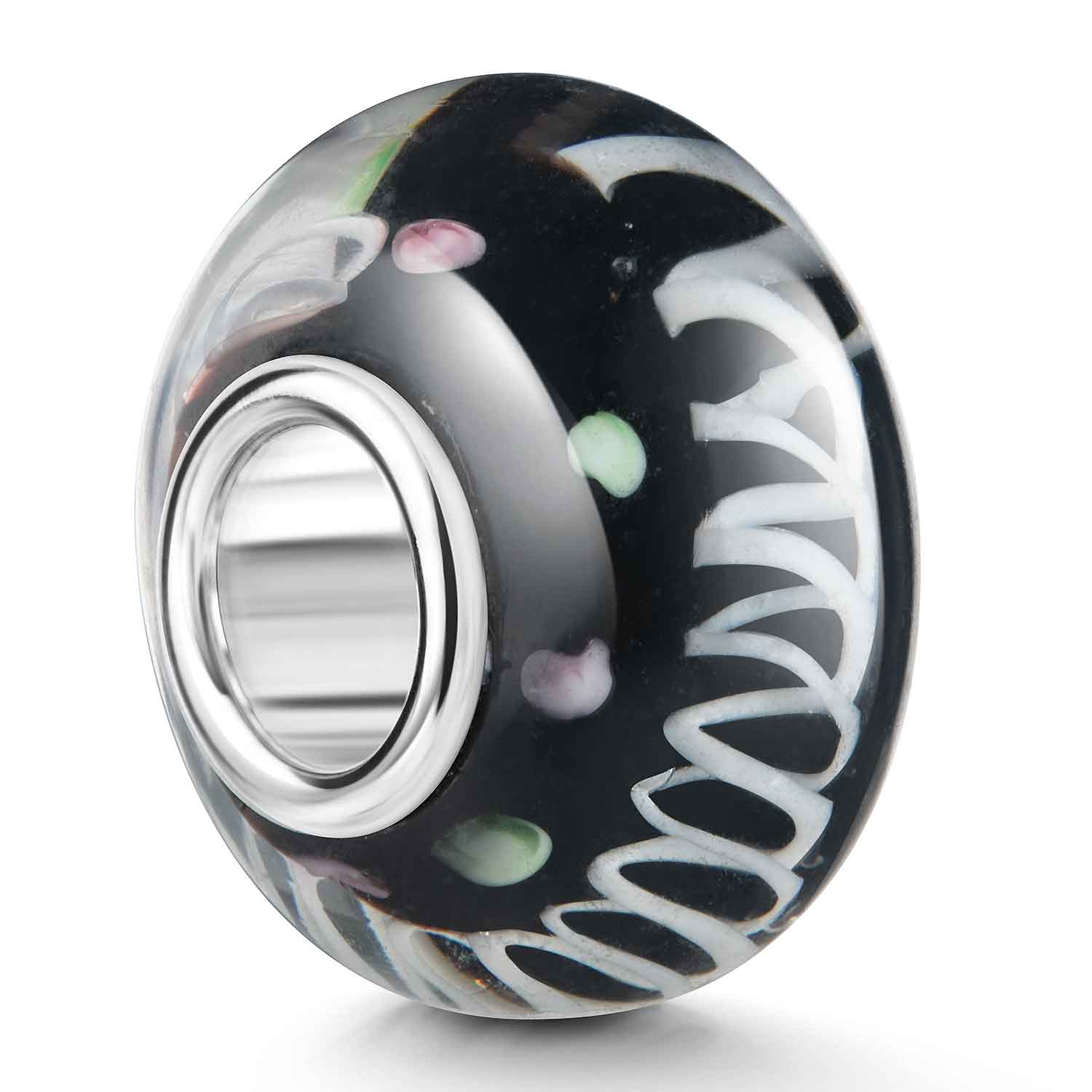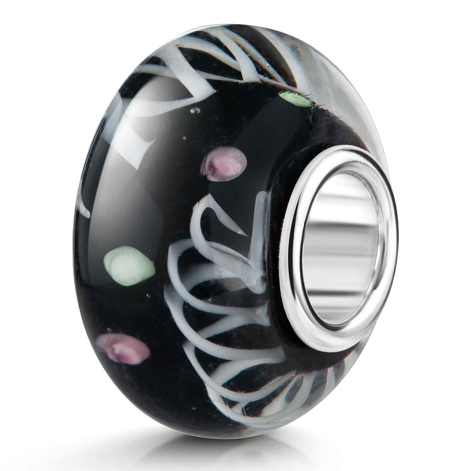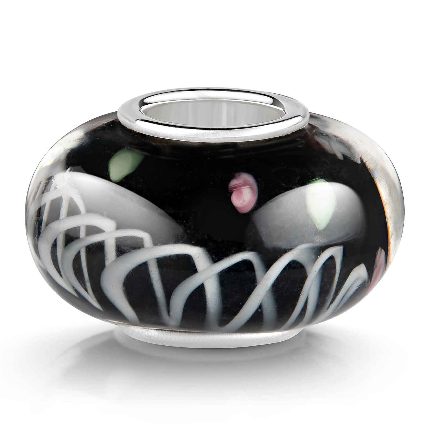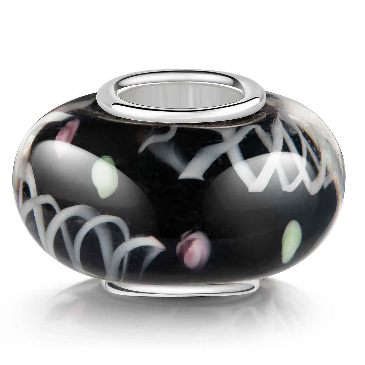 Interessant gemusterter schwarzer Glas Bead mit einer 925 Silber Hülse. Der Anhänger ist kompatibel mit Basisarmbändern jeglicher Hersteller.
