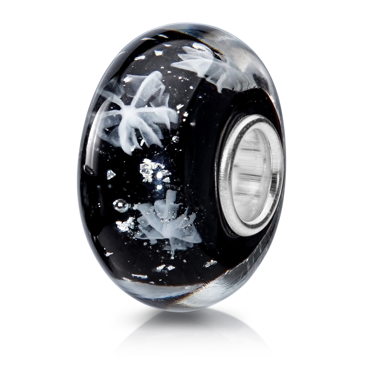 Schwarze Glas Bead Perle mit weißen Schneeflocken und Silberfolien-Stücken im Glas. Dieser Glas Bead ist mit einer Hülse aus 925 Silber ausgestattet und kompatibel zu Beads Armbändern & Ketten bis 4,4mm.