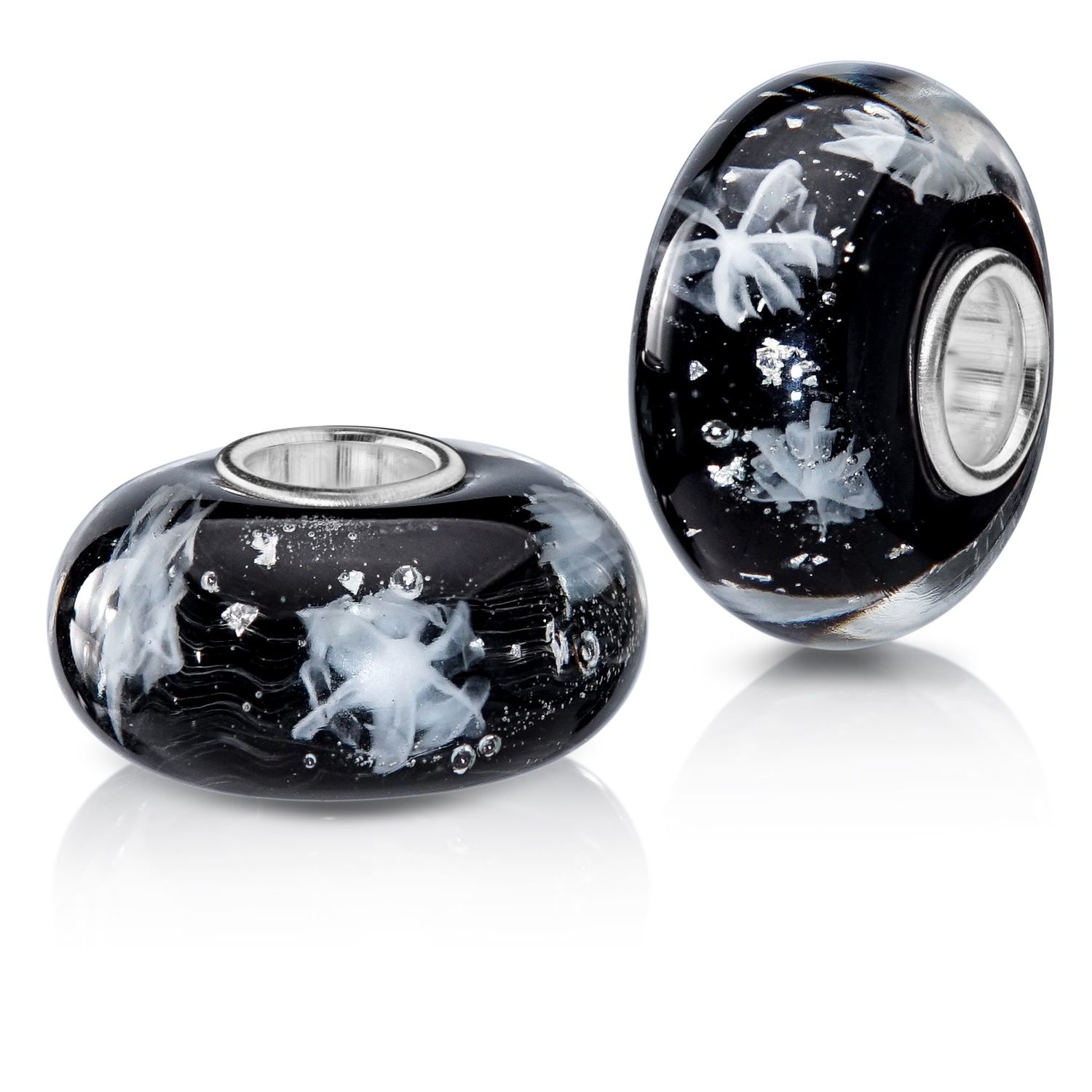 Dieser Glas Bead in Schwarz wurde mit weißen Schneeflocken und Silberfolienstücken im Glasinneren verziert. Im Inneren der Glasperle befindet sich eine Hülse aus reinem 925 Sterling Silber. Dieser Glas Bead ist passend zu allen gängigen Bead-Armbändern bis max. 4,4mm Breite. Es ist besonders geeignet für alle großen und bekannten Bead-Marken auf dem Markt.