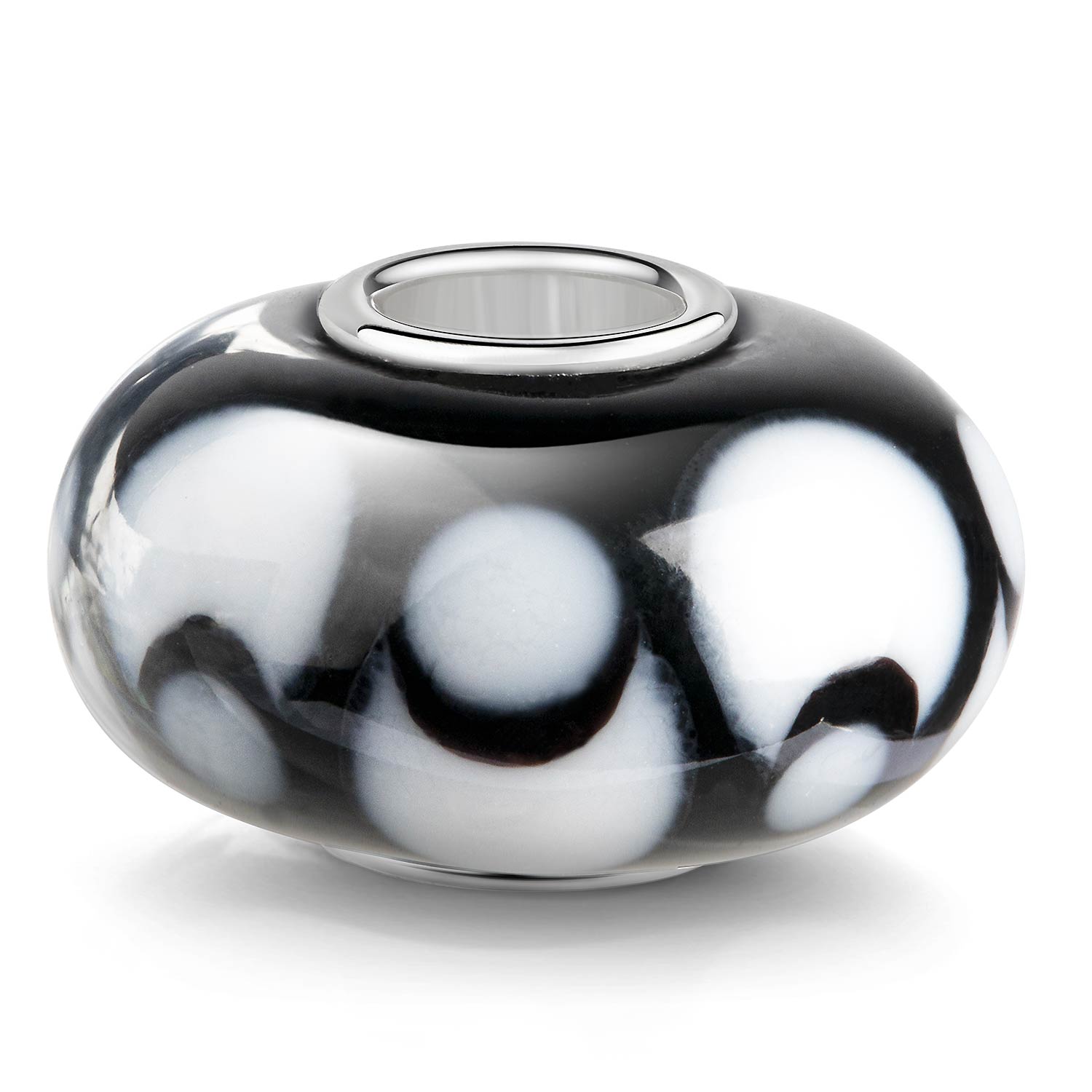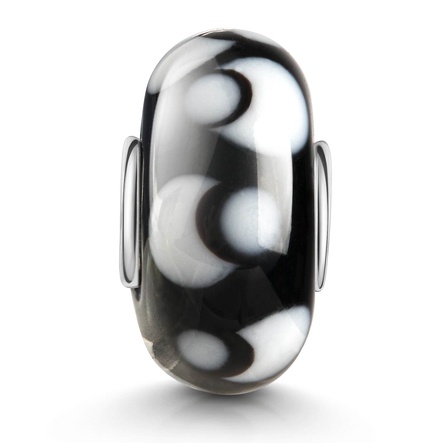 Edler schwarzer Bead, verziert mit weißem Muster / Punkten. Die Hülse besteht aus 925 Sterling Silber und ist für Beads Armbänder und Ketten bis max 4,2mm Durchmesser geeignet.
