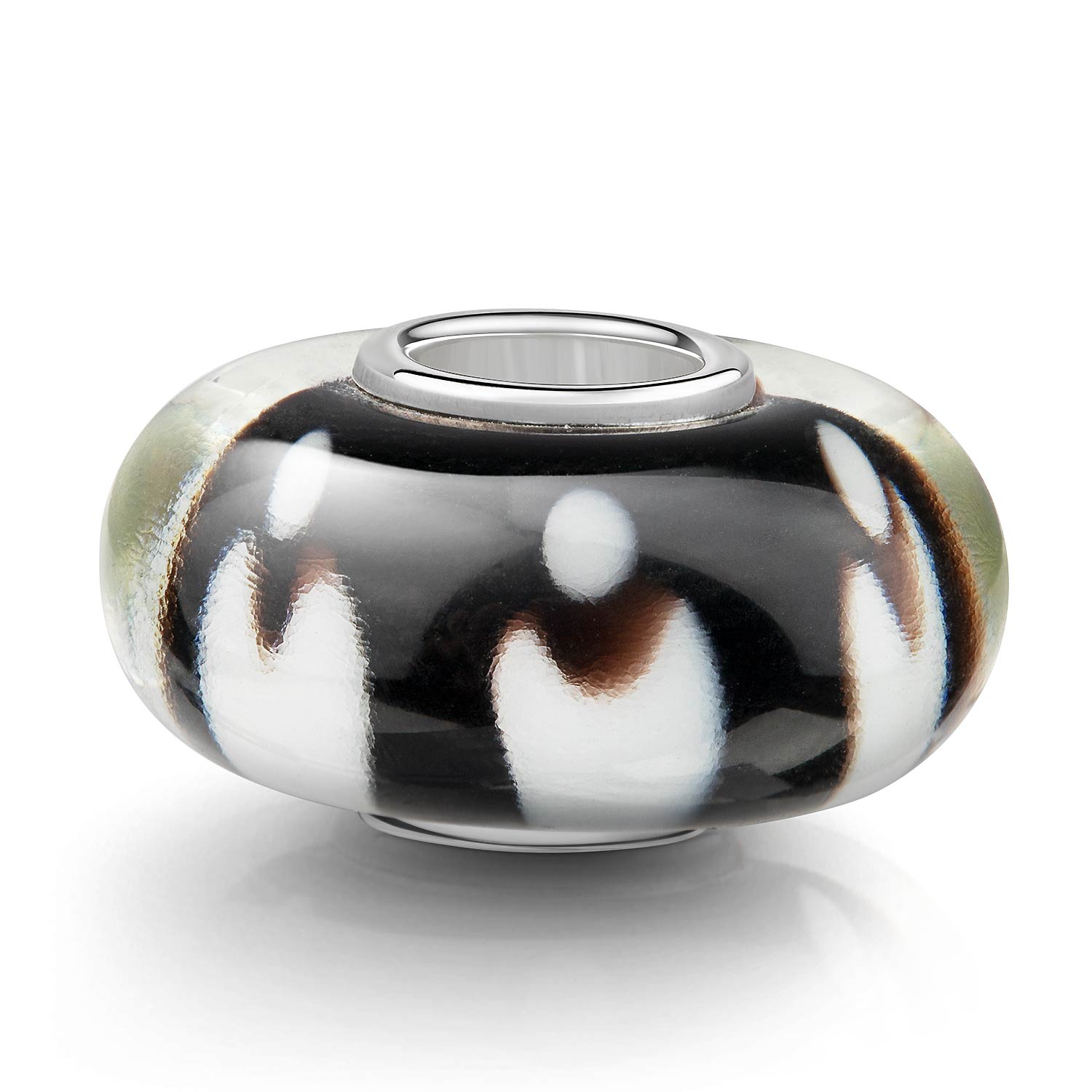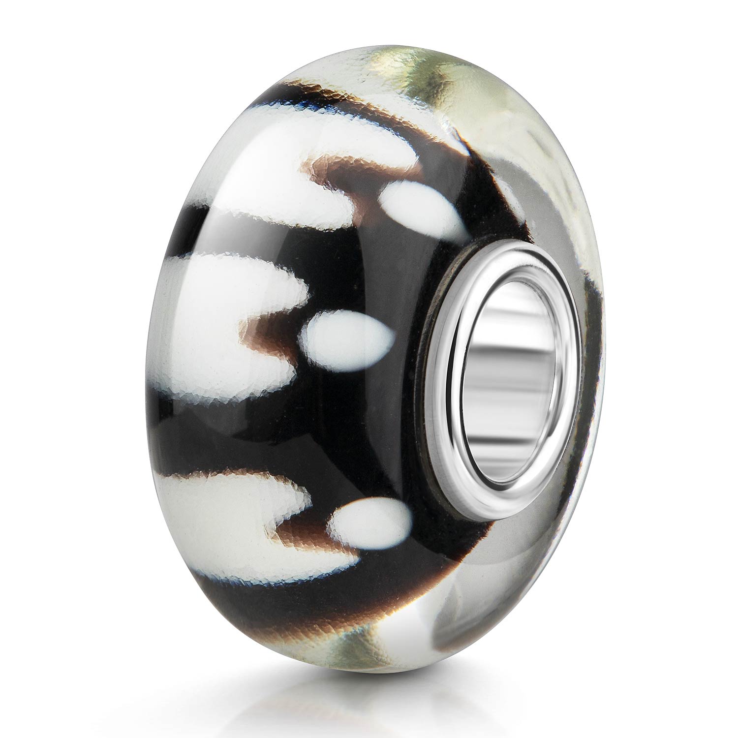 Schwarzer Glas Bead mit weißem Muster. Die Hülse besteht aus 925 Sterling Silber und ist für Beads Armbänder und Ketten bis max 4,2mm Durchmesser geeignet.