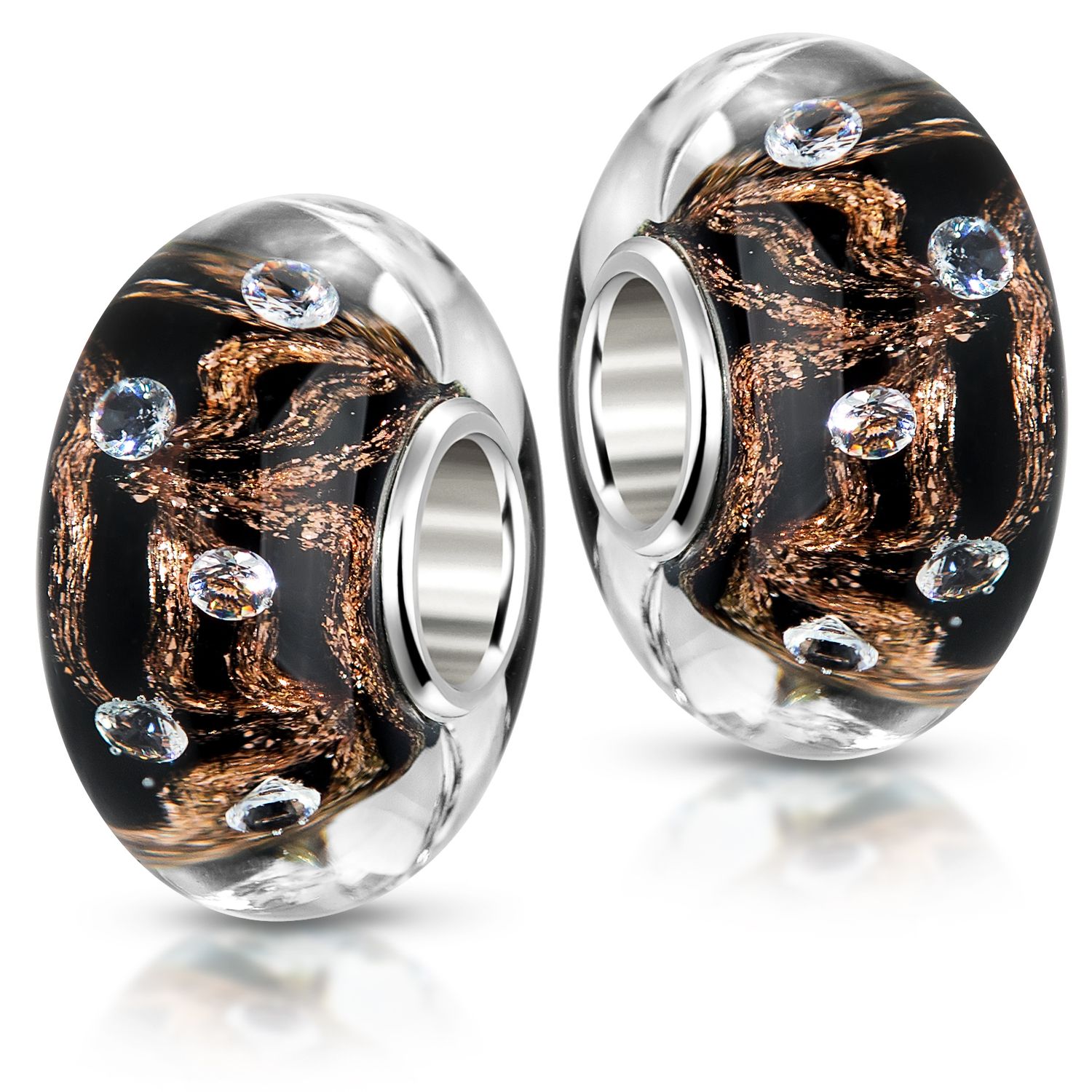 Dieser Glas Bead in schwarz wird Sie durch die 10 eingearbeiteten Zirkonia Steine sowie den funkelnden Glitzer Goldfäden im Inneren des Glas Beads begeistern. Dieser Bead ist passend zu allen gängigen Beads Armbändern und Ketten bis max. 4,4mm Breite/ Durchmesser und ist daher für alle Marken Beads geeignet.