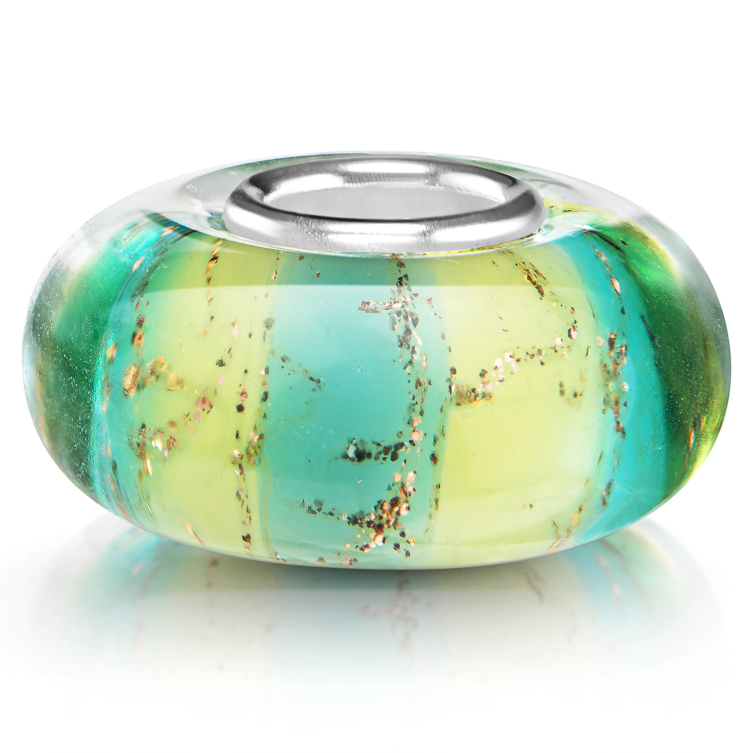 Gestreifter Glas Bead in Türkis und Hellgrün und goldenem Glitzerfaden im Glasinneren. Der Anhänger ist mit einer hochwertigen Hülse aus 925 Sterling Silber ausgestattet. Er eignet sich für alle handelsüblichen Beads Armbänder und Ketten bis max. 4,4mm Breite und ist auch für alle gängigen großen Beads Marken geeignet.