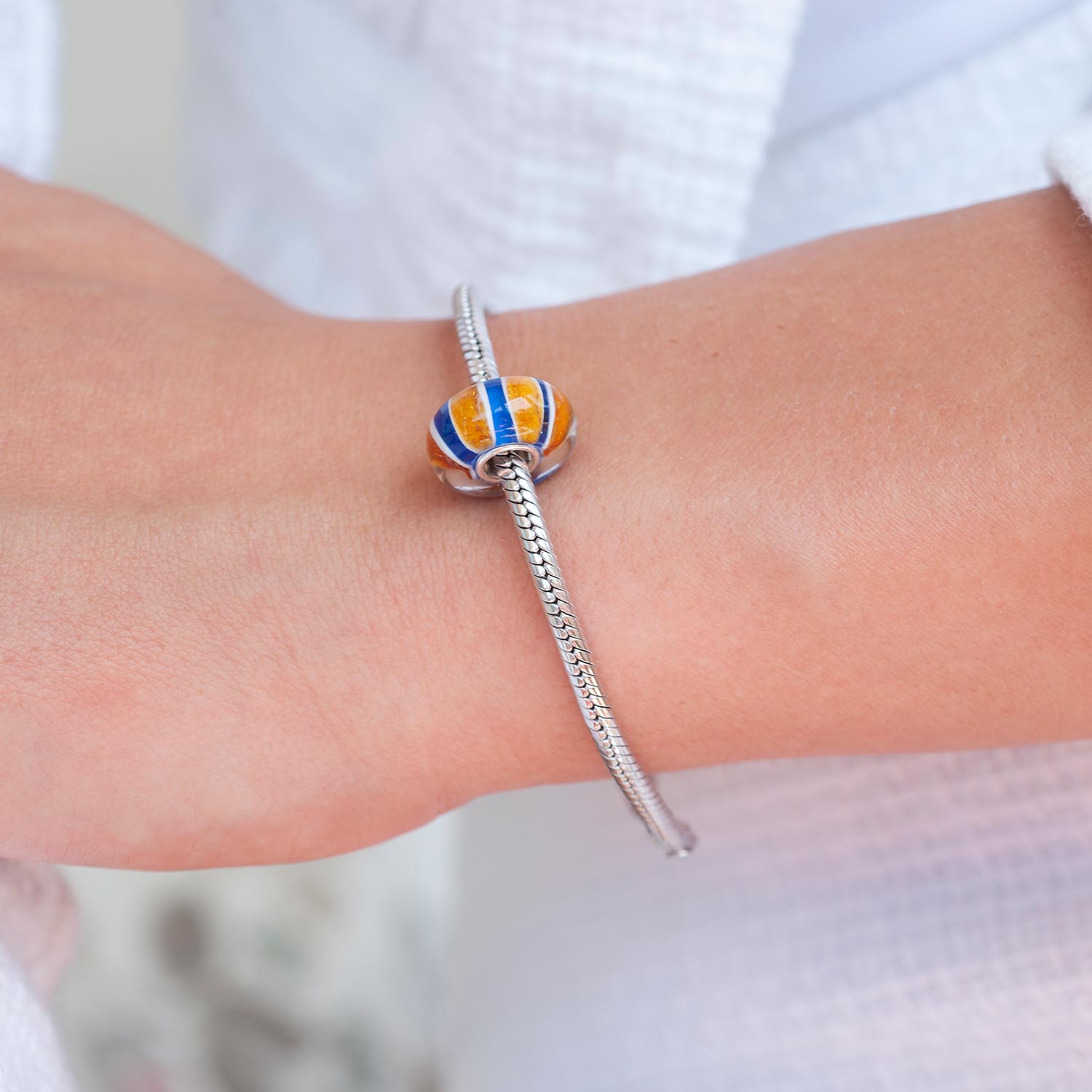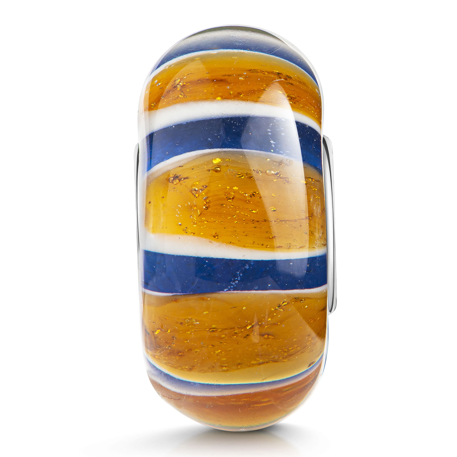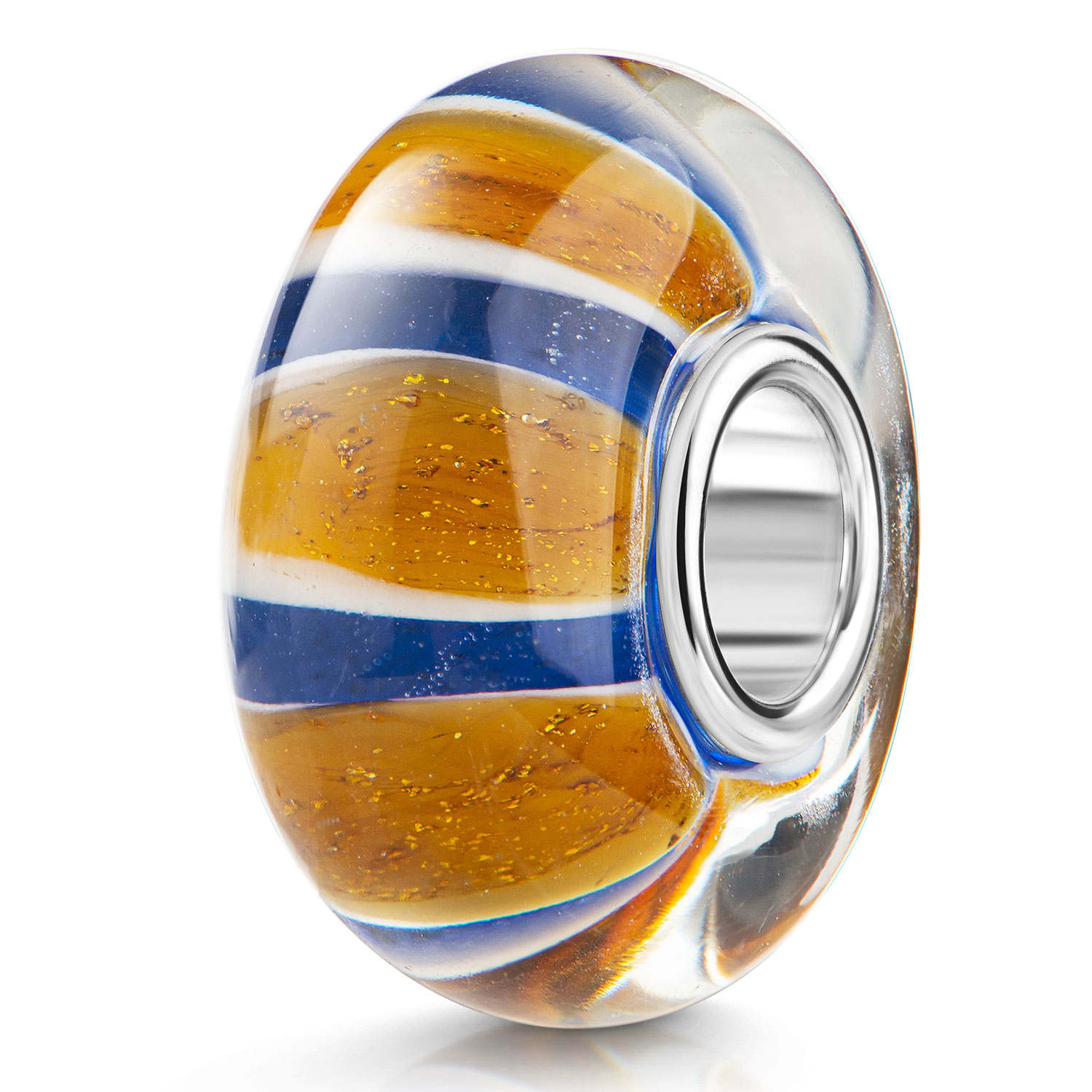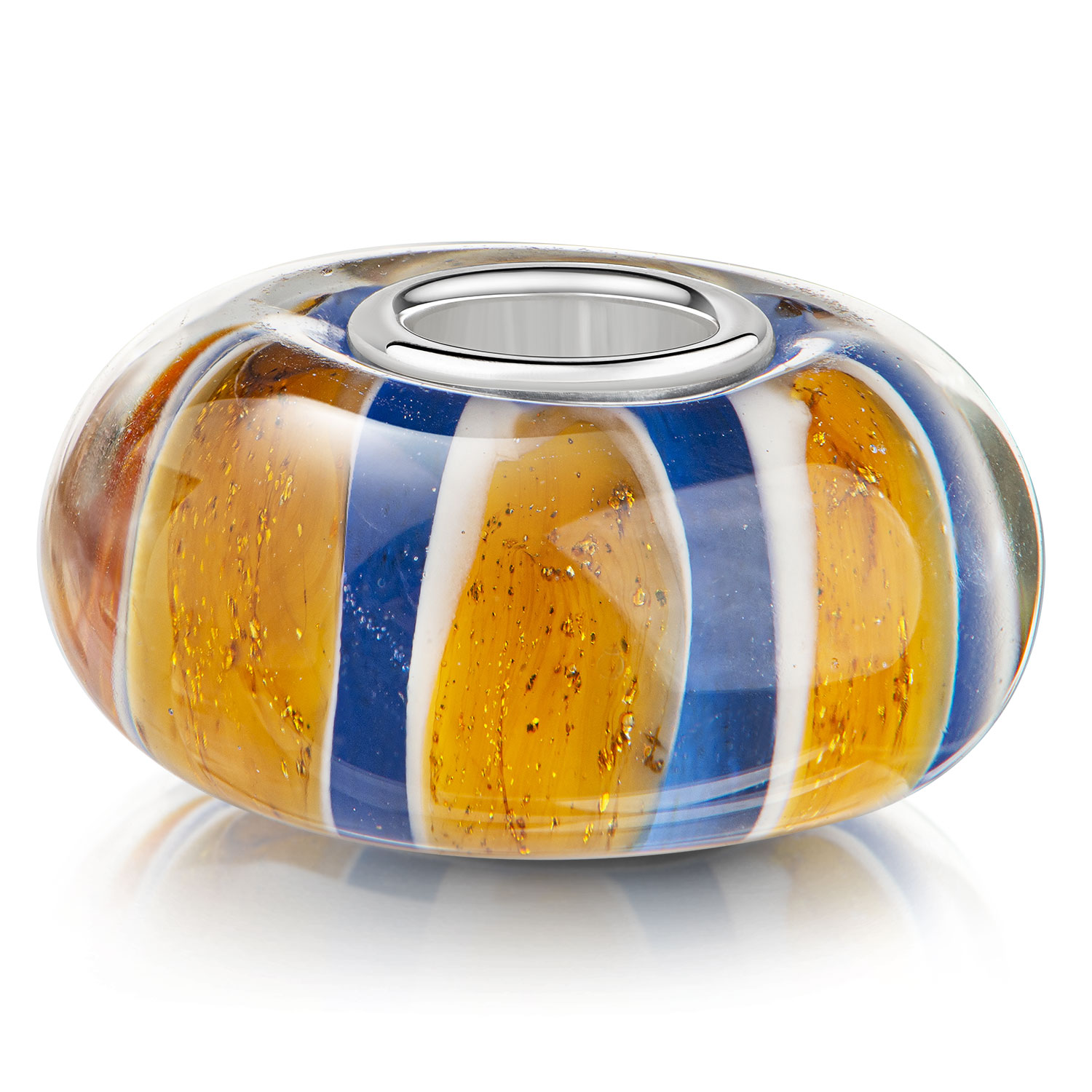 Blauer Glas Bead mit Streifen in Orange und Weiß, sowie goldenen Glitzerpartikeln im Glasinneren. Der Anhänger ist mit einer hochwertigen Hülse aus 925 Sterling Silber ausgestattet. Er eignet sich für alle handelsüblichen Beads Armbänder und Ketten bis max. 4,4mm Breite und ist auch für alle gängigen großen Beads Marken geeignet.