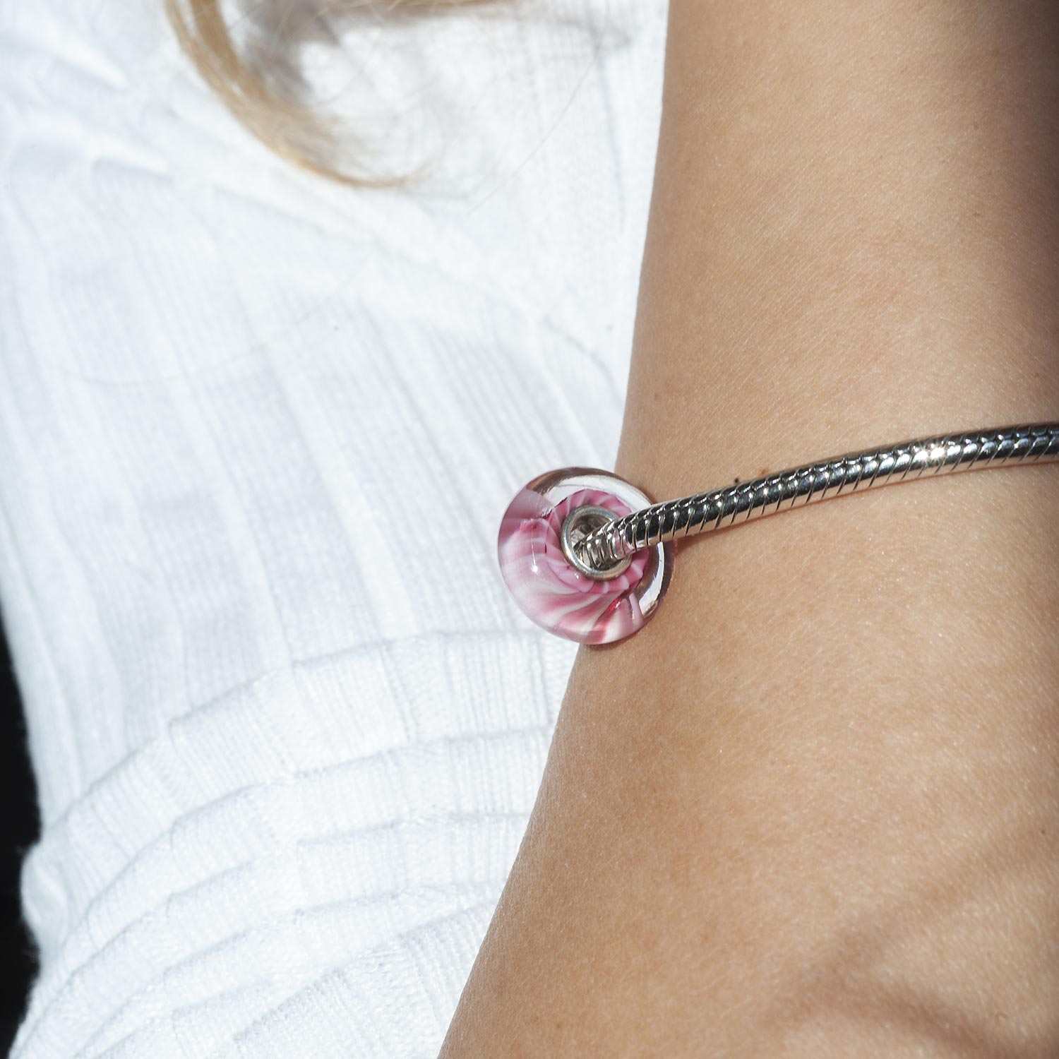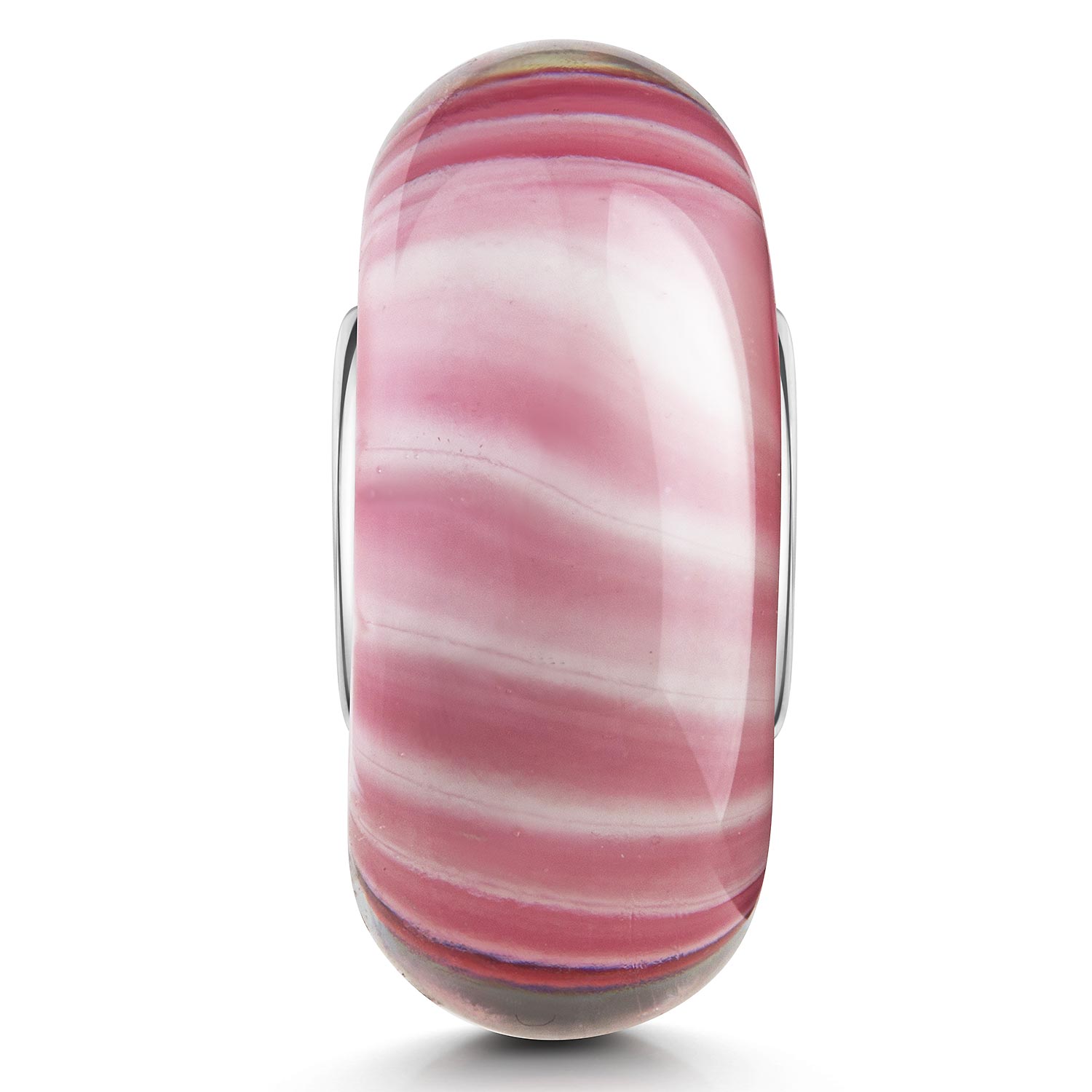 Dieser Glas Bead ist mit dünnen Streifen in Rosa und Weiß versehen und mit einer Hülse aus massivem 925 Sterling Silber ausgestattet. Der Bead ist passend zu allen gängigen Beads Armbändern und Ketten bis max. 4,4mm Breite / Durchmesser und ist daher auch besonders für alle gängigen großen Beads Marken geeignet.
