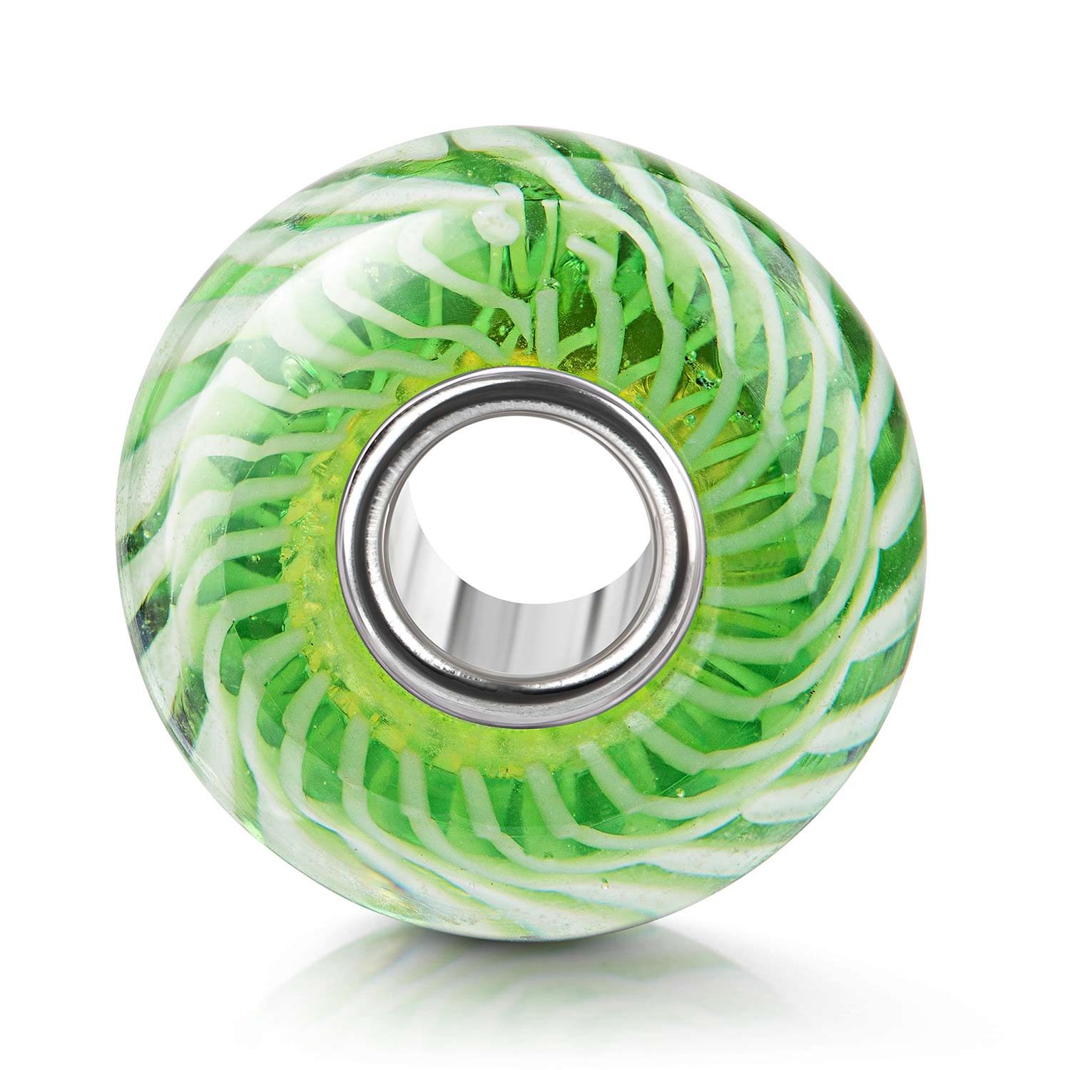 Grüner Glas Bead mit weißem Streifenmuster und einer Hülse aus 925 Sterling Silber. Die Glasperle ist für Beads Armbänder und Ketten bis max 4,4mm Durchmesser geeignet.