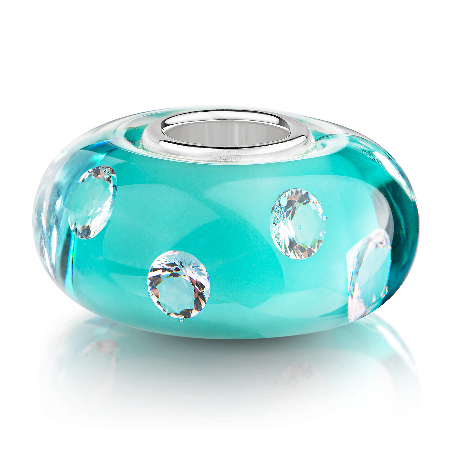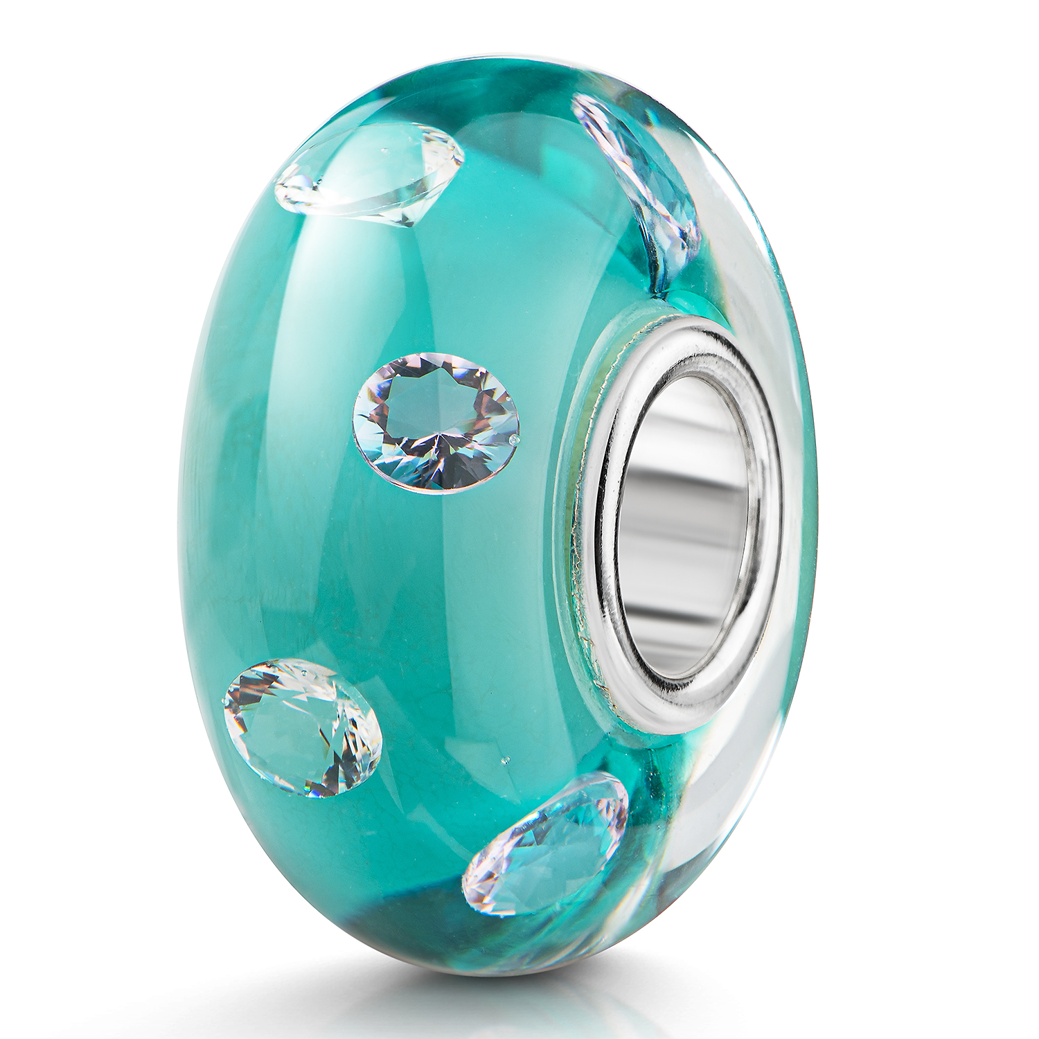 Wunderschöner türkiser Glas Bead mit 8 eingearbeiteten Zirkonia im Glasinneren und einer 925 Silber Hülse. Die Glasperle ist für Beads Armbänder und Ketten bis max 4,4mm Durchmesser geeignet.