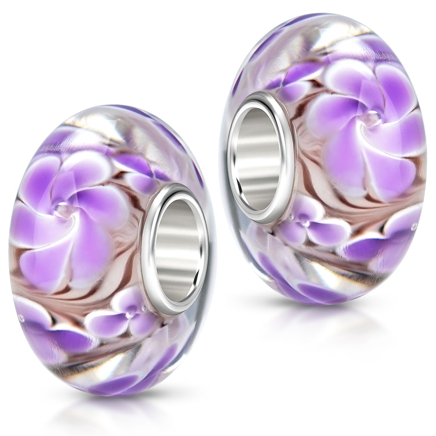 Lassen Sie sich von diesem Glas Bead mit Blüten in den Farben Violett und Lila bezaubern! Der Bead ist zusätzlich mit einer 925 Silber Hülse ausgestattet. Er ist passend zu allen gängigen Beads Armbändern und Ketten bis max. 4,4mm Breite und ist daher für alle Marken Beads geeignet.
