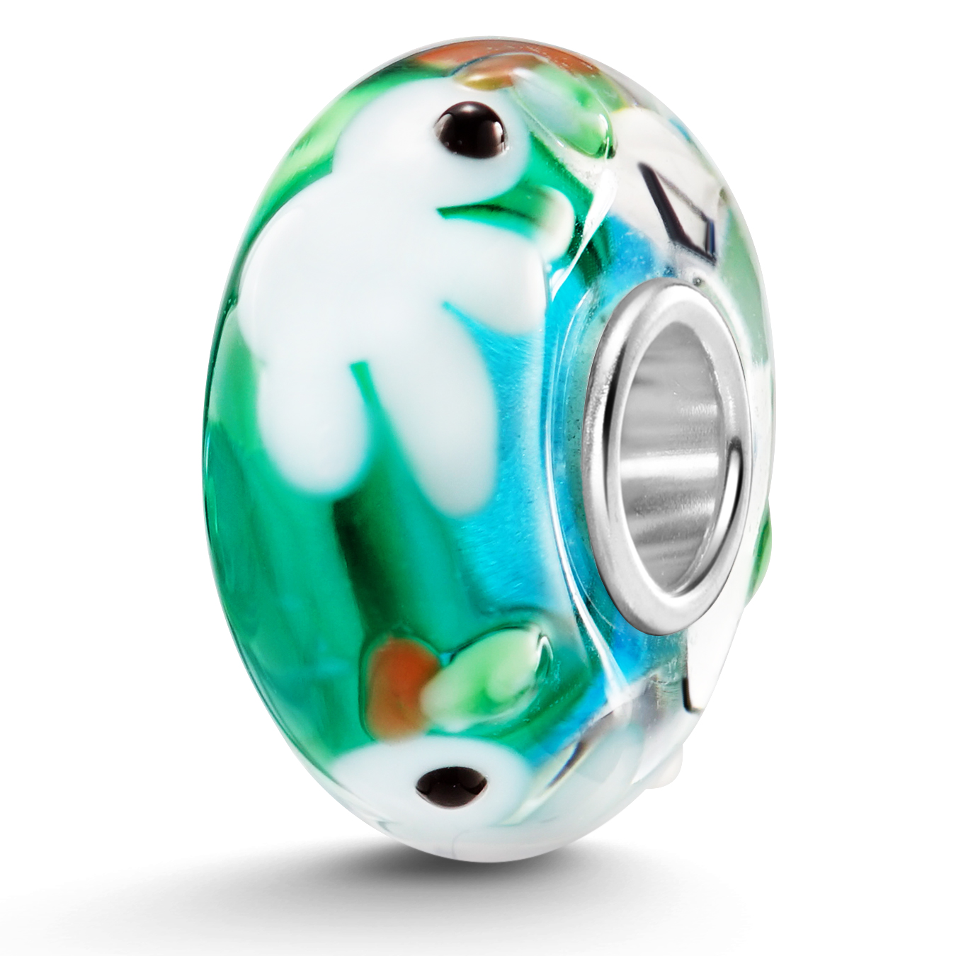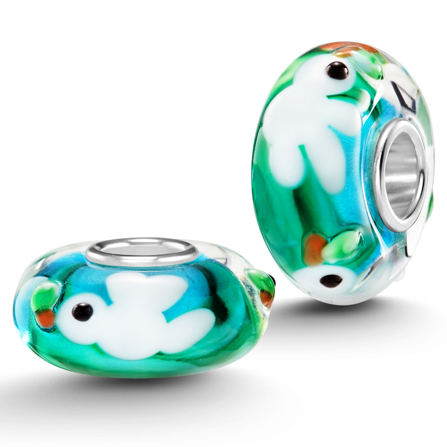 Dieser Glas Bead mit weißen Vögeln auf blau / grünem Hintergrund bringt Abwechslung auf Ihr Beadarmband. Dieser Bead ist passend zu allen gängigen Beads Armbändern/ Ketten mit einem max. Durchmesser von 4,4mm. Somit ist er auch kompatibel zu allen bekannten Beads-Marken. Tragen Sie diesen Bead an einem Armband oder als edlen Beads Kettenanhänger.