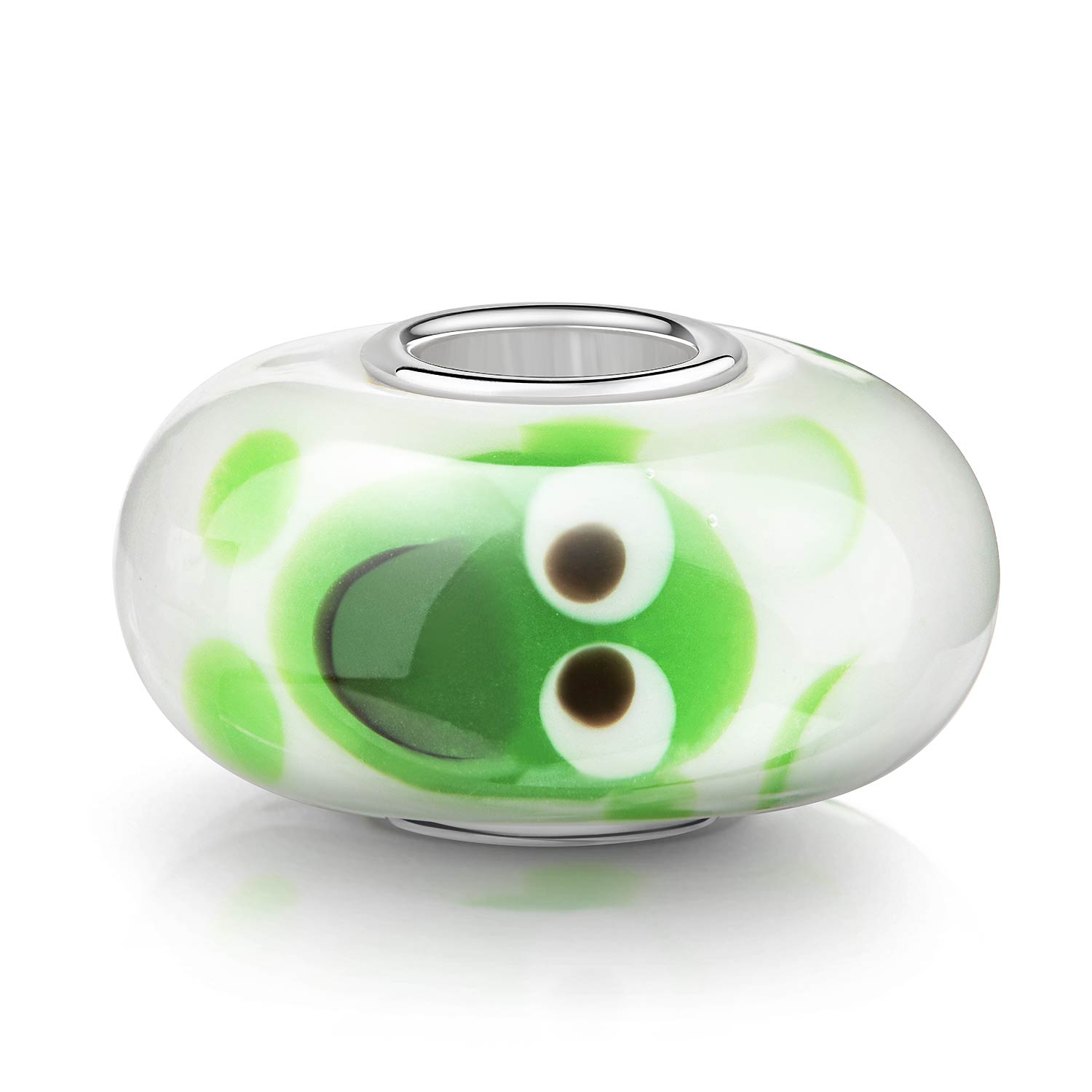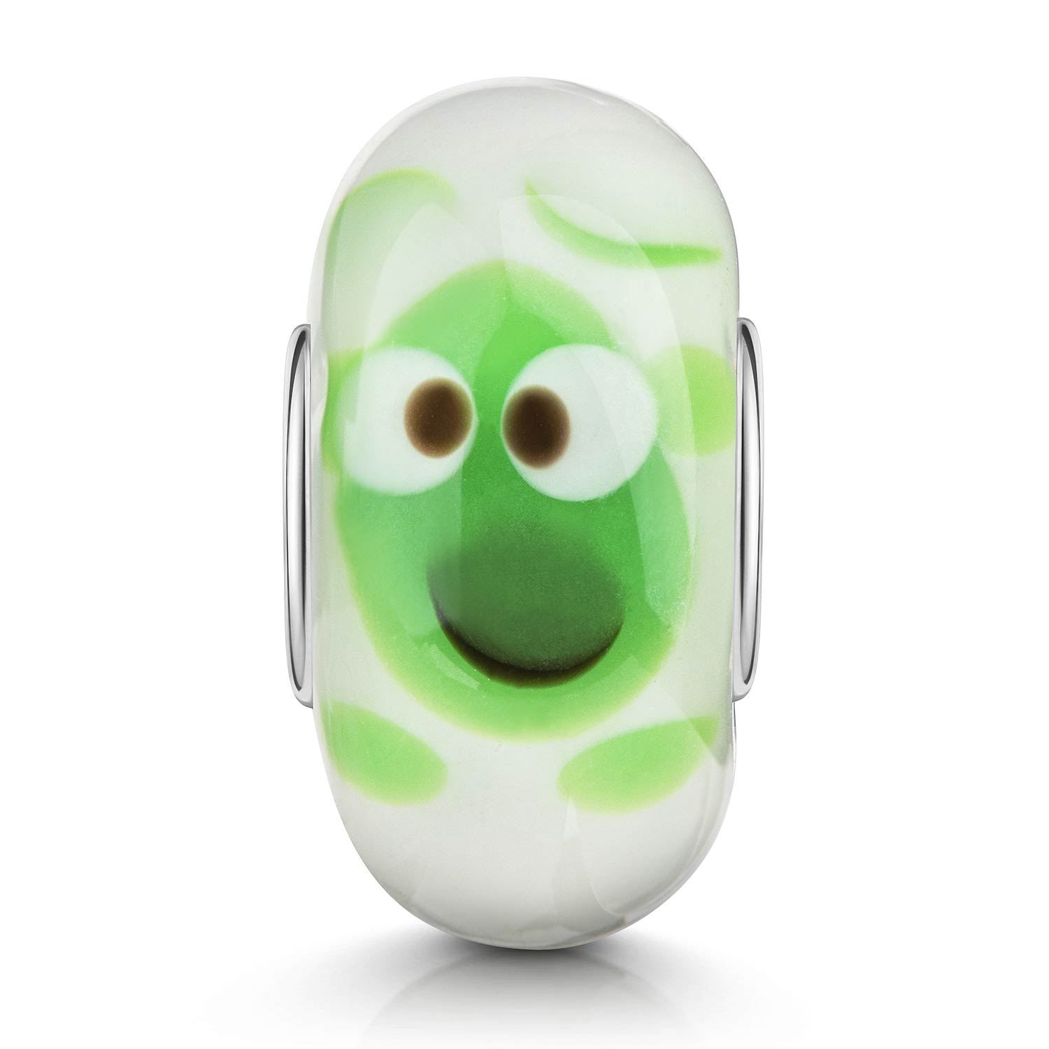 Niedlicher Glas Bead mit lächelnden Alien Gesicht in Weiß / Grün. Die Glasperle ist mit einer 925 Sterling Silber Hülse ausgestattet und ist für Beads Armbänder und Ketten bis max 4,2mm Durchmesser geeignet.