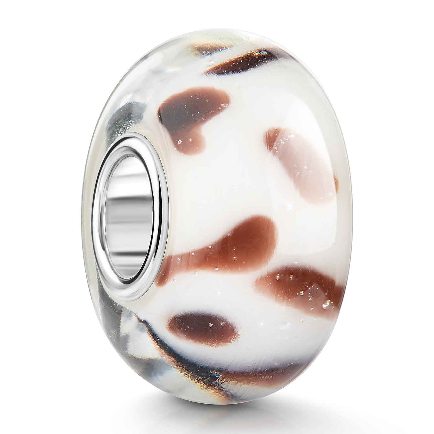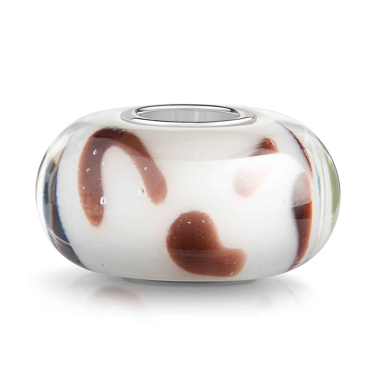 Bead aus weiß-transparentem Glas mit braunem Phantasie Tinten-Muster. Der Bead verfügt über eine Hülse aus 925 Silber und passt auf Armbänder und Ketten aller üblichen Beads Marken bis 4,4mm Stärke.