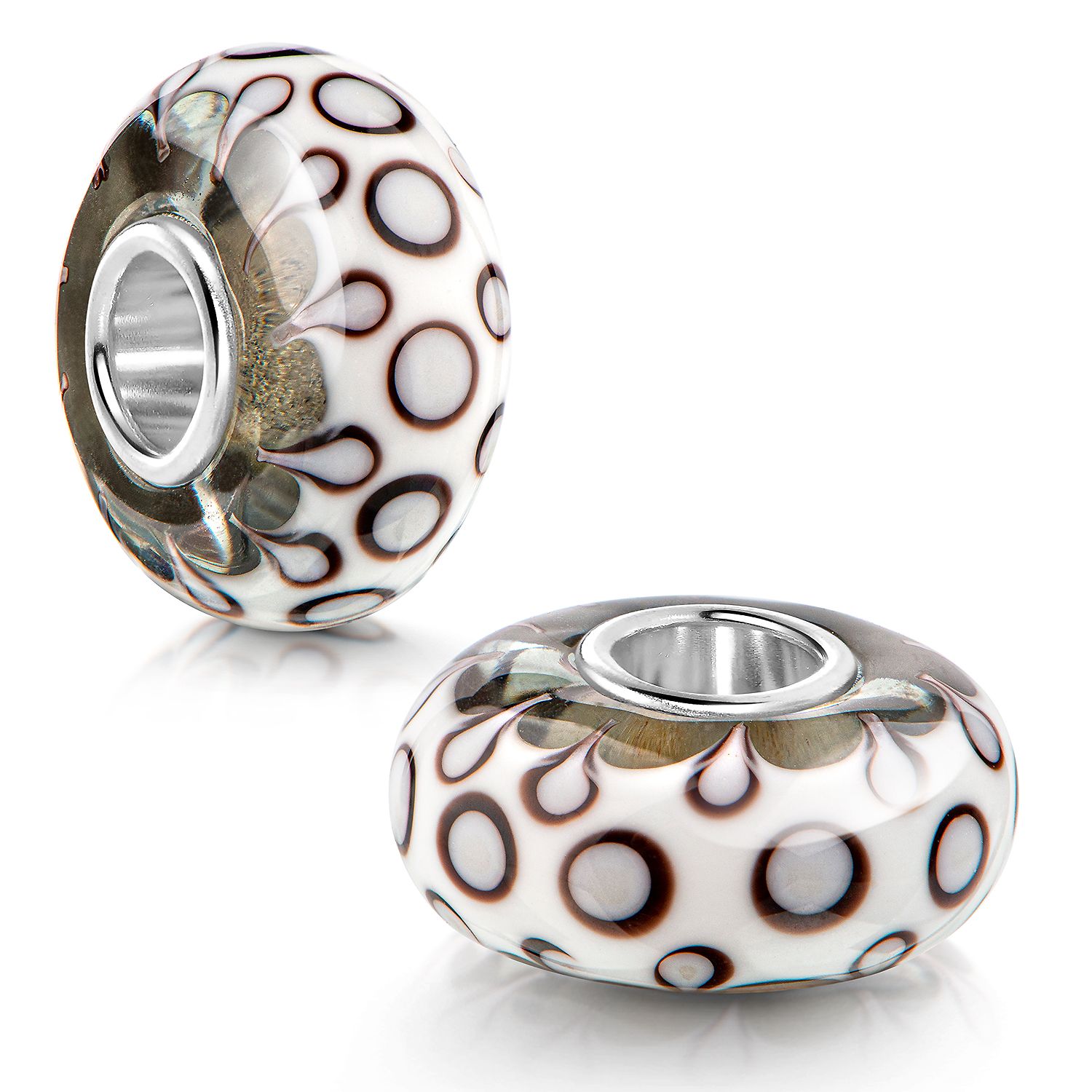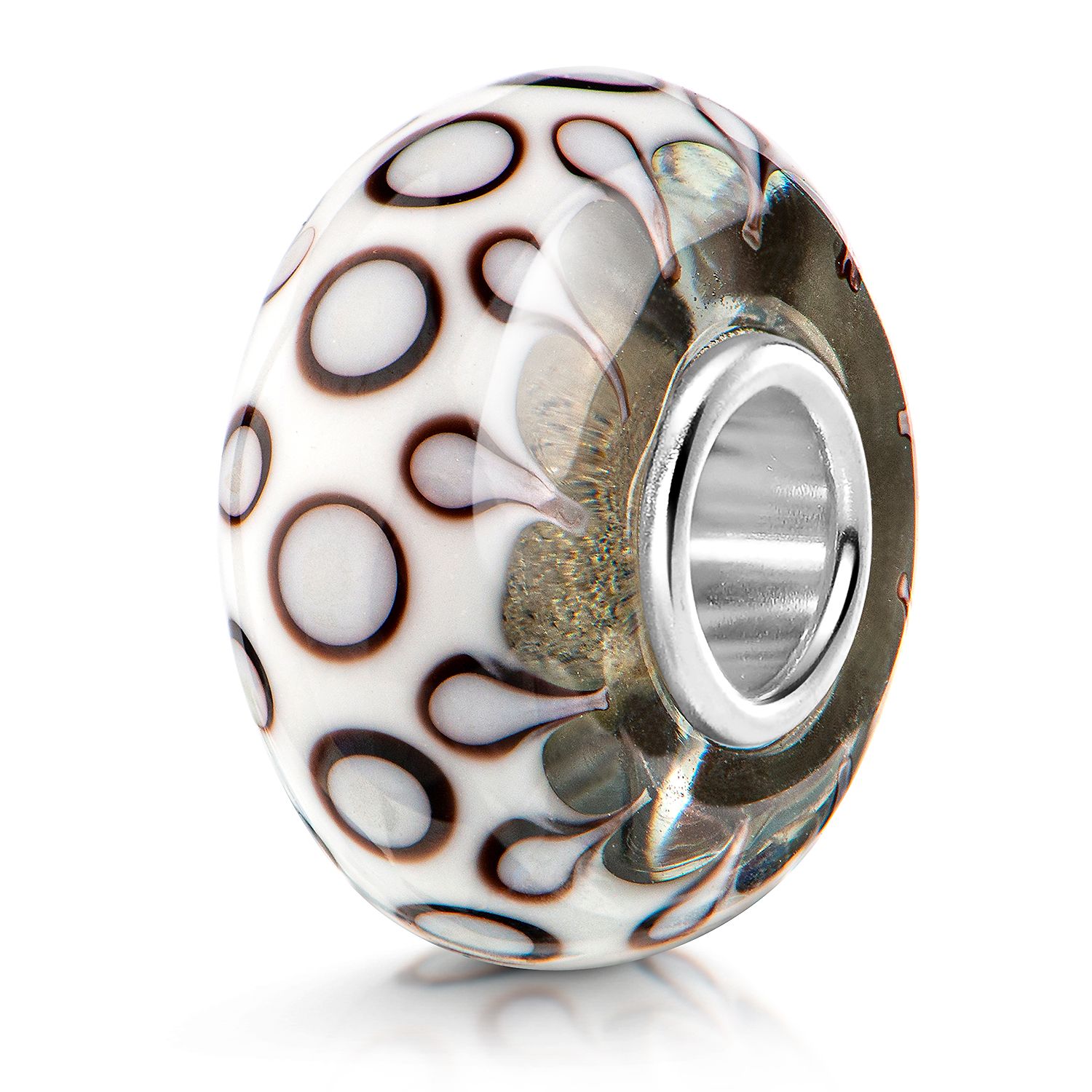 Weißer Glas Bead mit braun-schwarzen Kreismotiven uns 925 Silber Hülse. Der Bead ist kompatibel mit allen gängigen Schmuck Bead-Armbändern & Ketten anderer großen Marken bis max. 4,4mm Lochdurchmesser.