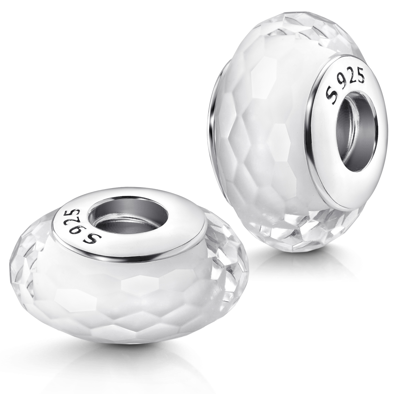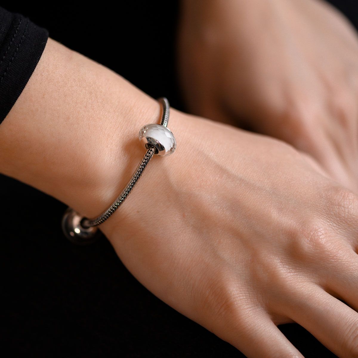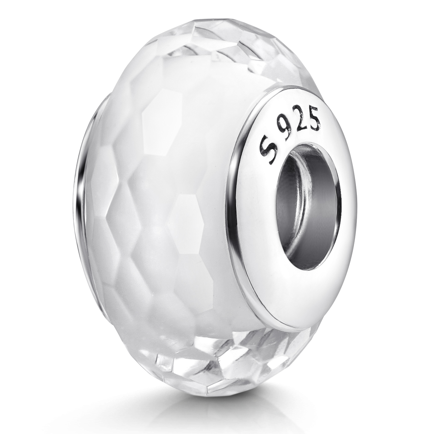 Das Besondere an diesem Charm ist die breite und massive 925 Sterling-Silber Hülse, welche mit einem Gewinde ausgestattet ist. Der Facettenschliff erzeugt zudem einen dezenten Glitzereffekt auf der Oberfläche des weißen Glas Beads.