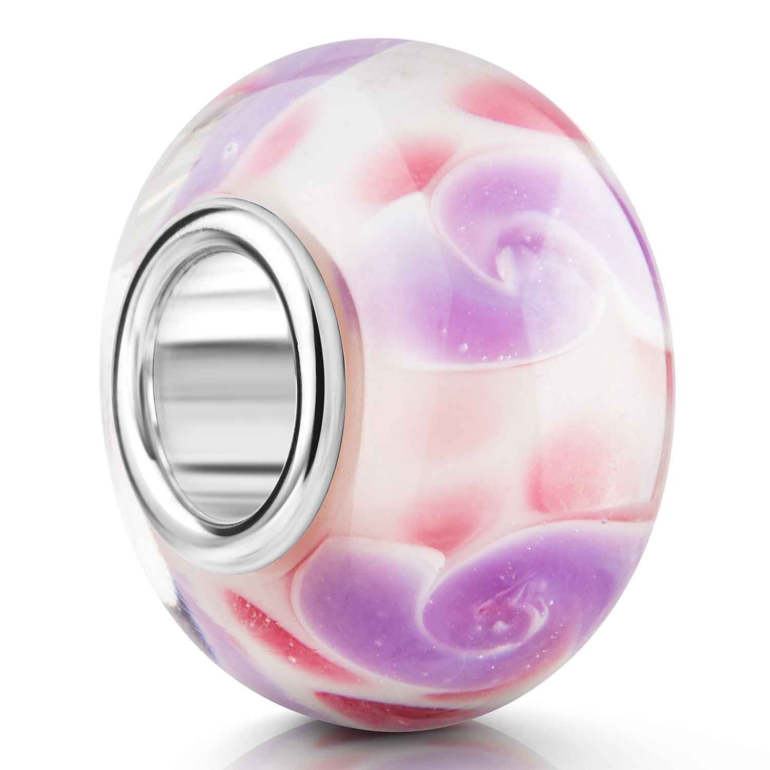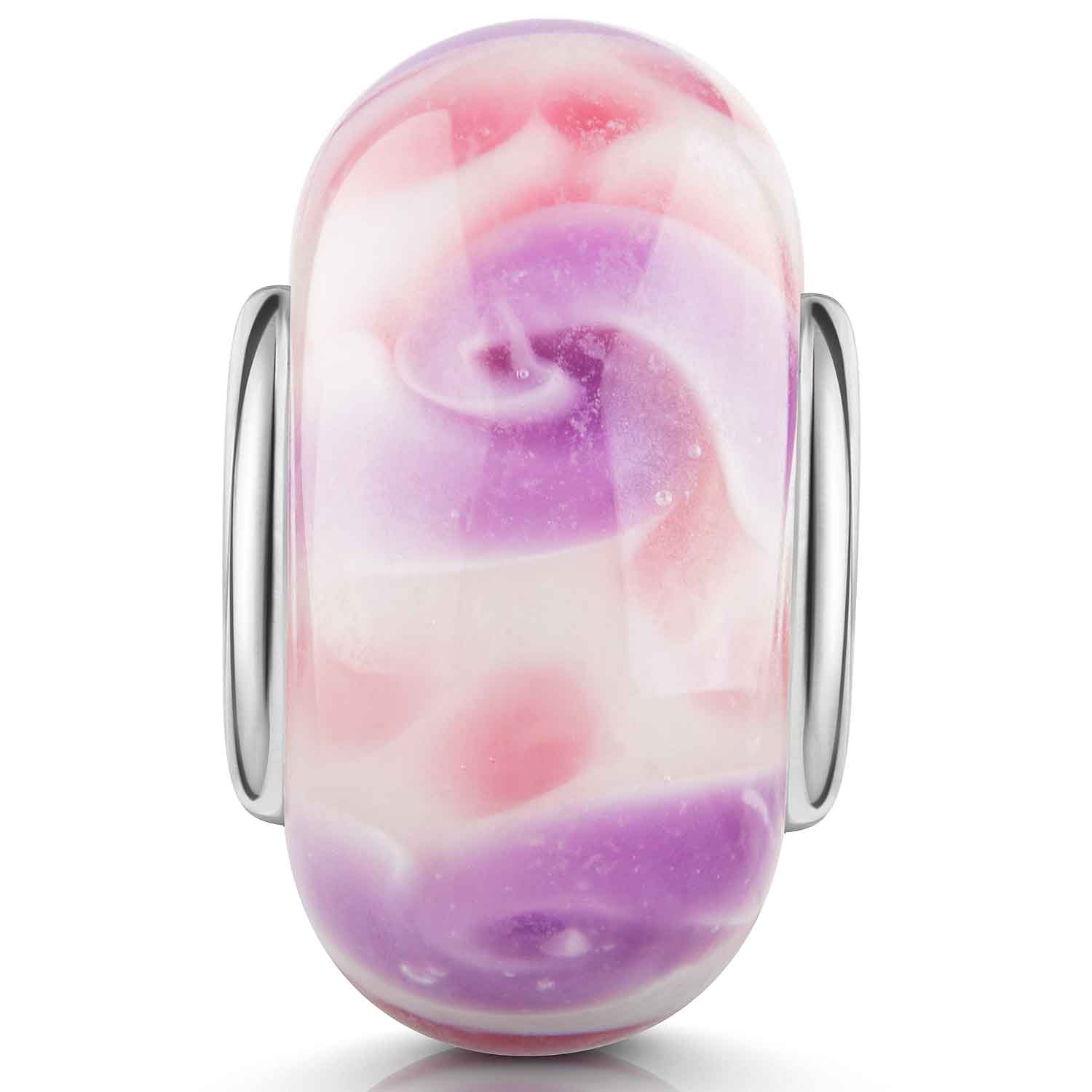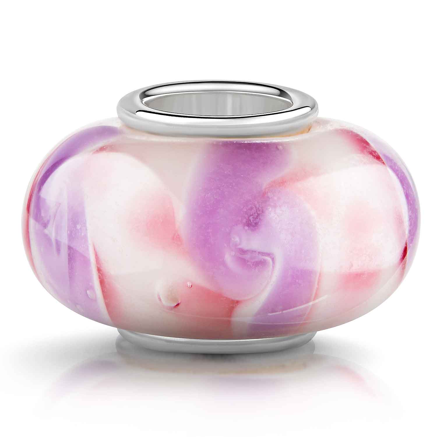 Wunderschöner Glas Bead in Weiß und Rosa mit lila Rosenblüten. Die Glasperle ist mit einer Hülse aus 925 Sterling Silber ausgestattet und eignet sich für Beads Armbänder und Ketten bis max 4,4mm Durchmesser.
