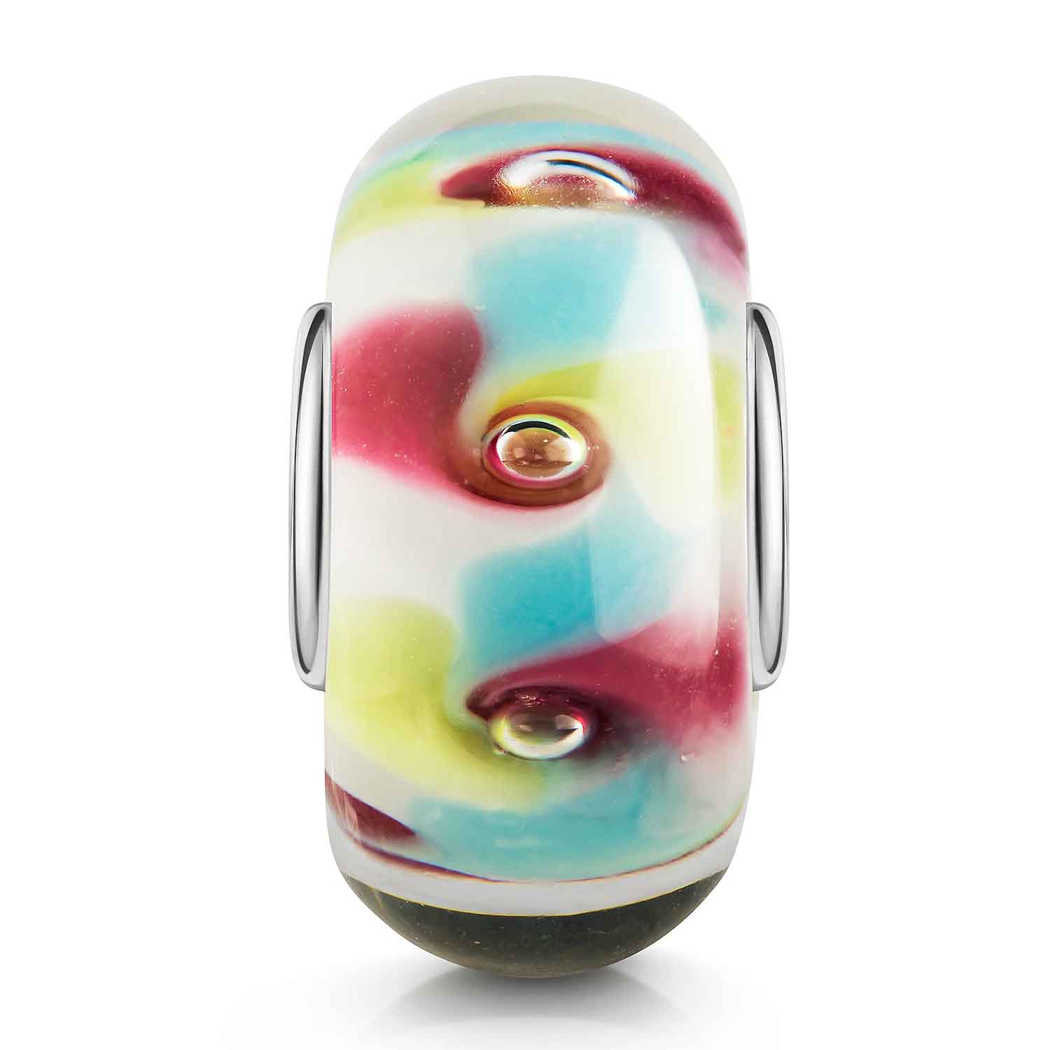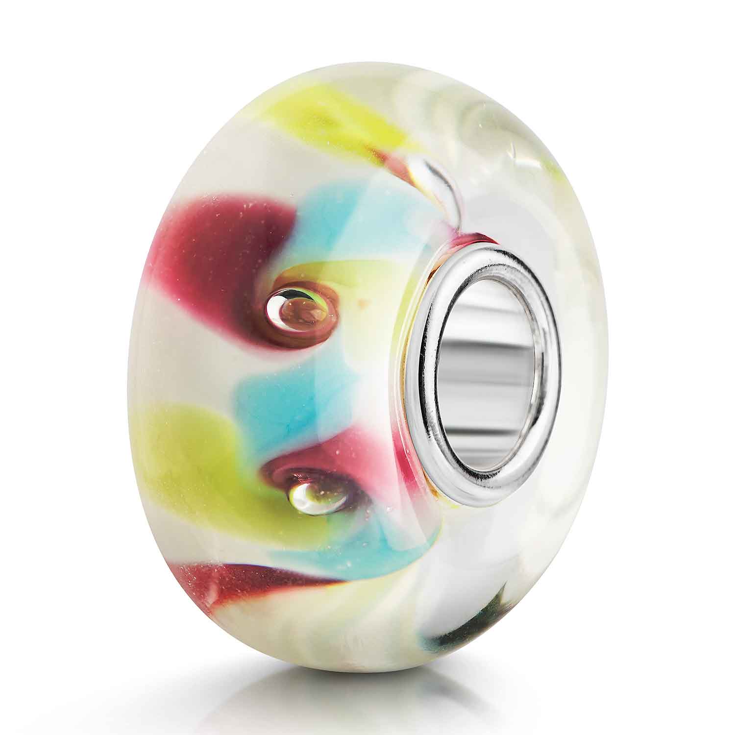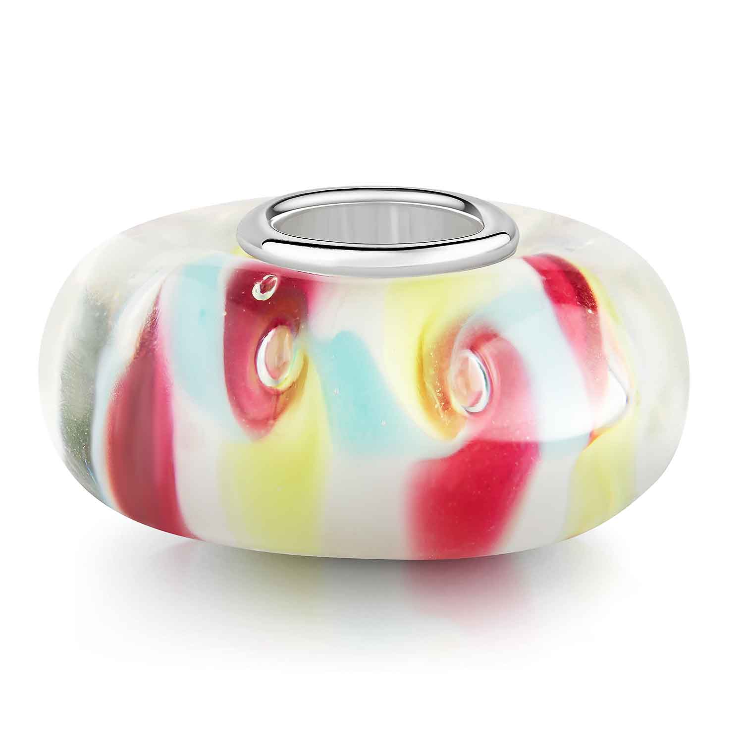 Wunderschöner weißer Glas Bead mit Wirbel Motiven in Pink, Gelb und Blau und einer 925er Sterling Silber Hülse. Der mehrfarbige Bead ist passend zu allen gängigen Schmuck Bead-Armbändern & Ketten anderer großer Marken bis max. 4,4mm Lochdurchmesser.