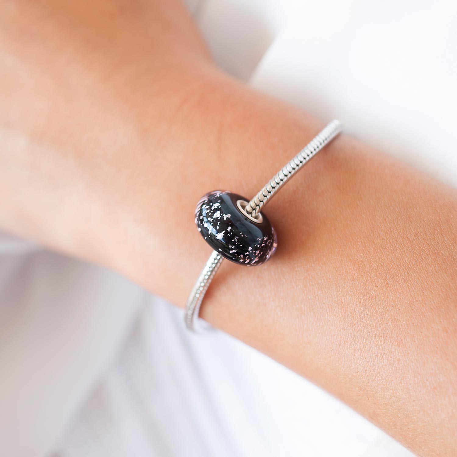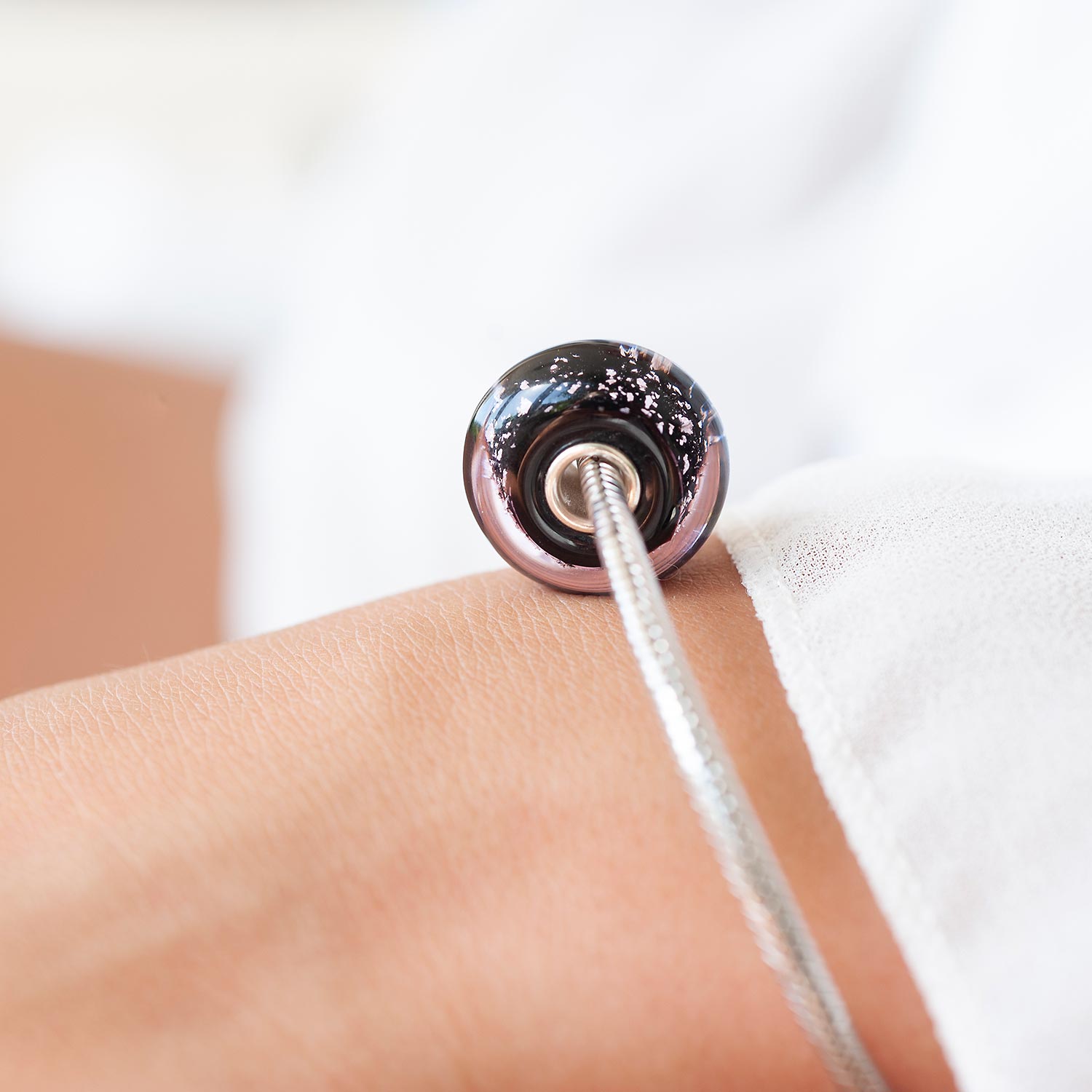 Unser XXL Bead in Übergröße (10 x 20mm) eignet sich ideal zum Tragen an einer Halskette. Der Glasbead hat eine eingearbeitete Glitzerfolie in Rosa im Glasinneren und verfügt über eine Hülse aus 925 Sterling Silber. Der Anhänger passt auf alle handelsüblichen Beads Ketten mit einem maximalen Durchmesser von 4,4mm und ist damit kompatibel zu den meisten Ketten bekannter Hersteller.