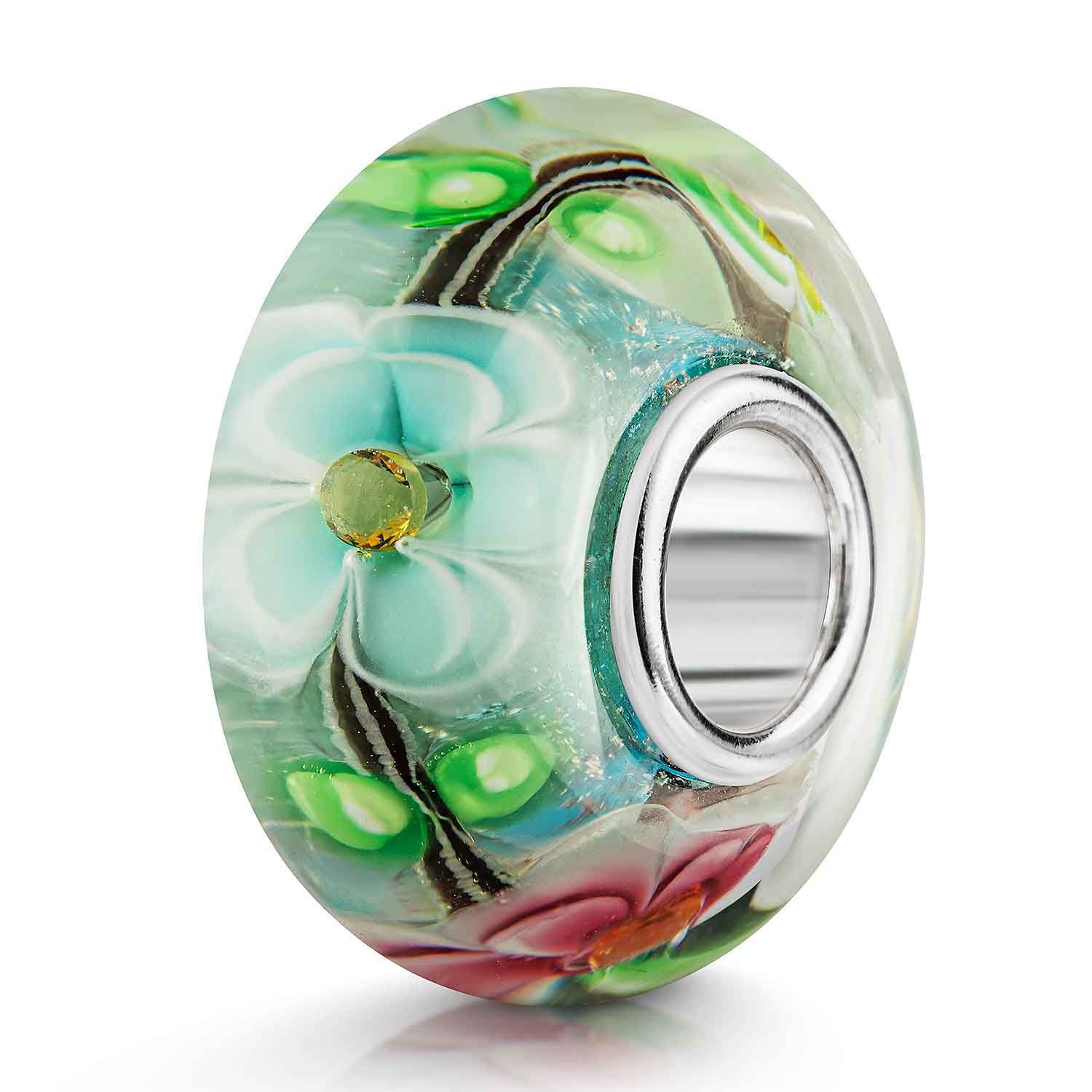 Fröhlicher Glas Bead mit hellblau glitzerndem Hintergrund und bunten Blüten. Der Bead ist mit eingearbeiteten Zirkonia inmitten jeder Blüte geschmückt. Er passt auf alle Beads Armbänder und Ketten mit einer max. Stärke von 4,4mm.