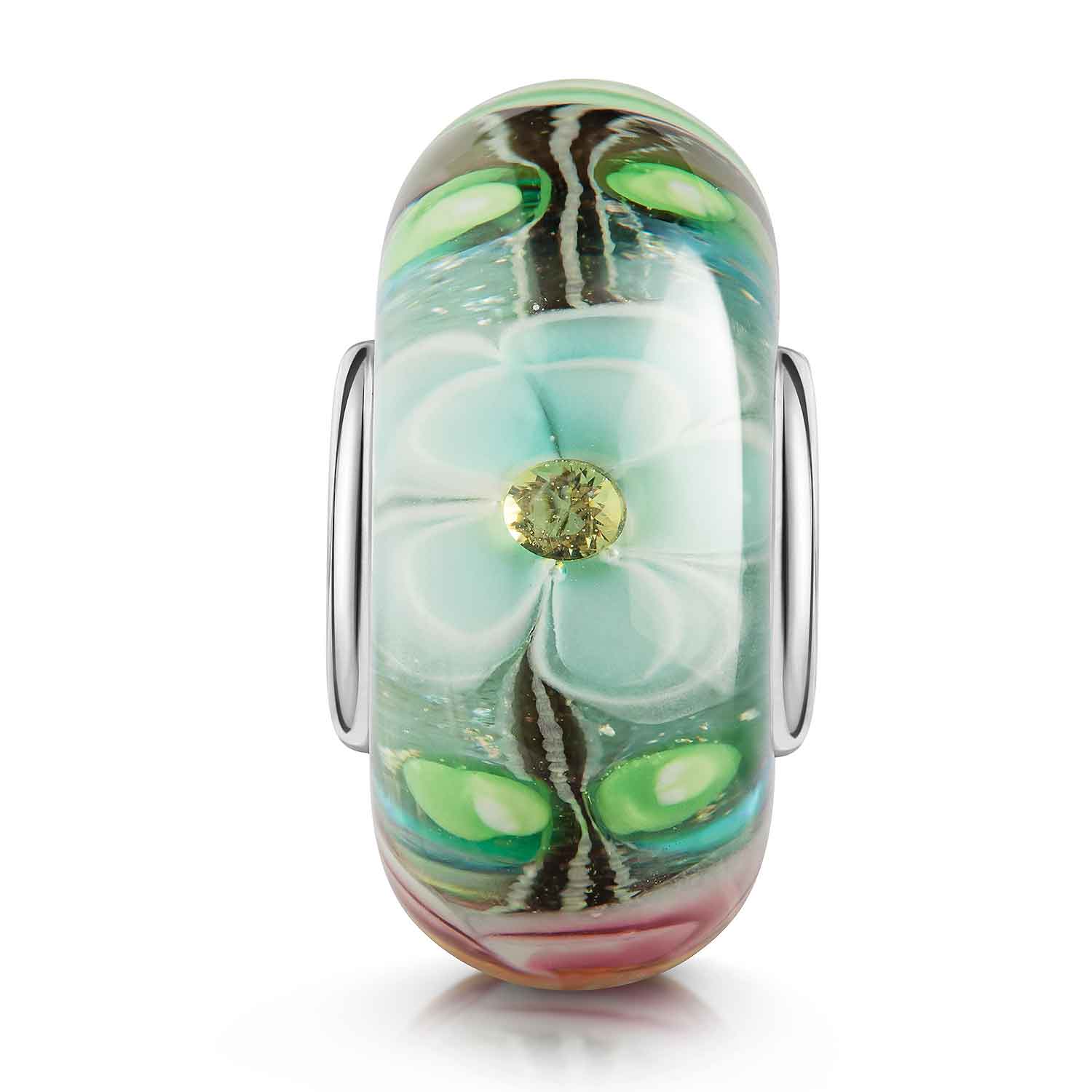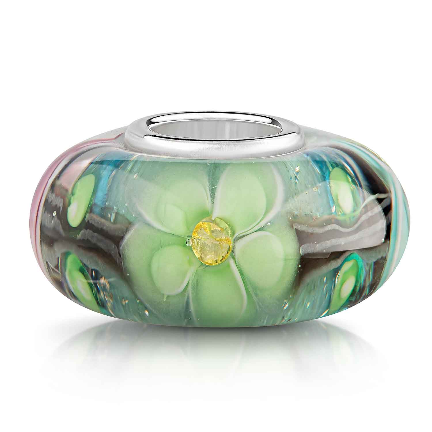 Unser Glas Bead zeigt 3 Blüten in den Farben Rosa, Hellblau und Hellgrün auf einem glitzernden hellblauen Untergrund. Mit 3 eingearbeiteten gelben Zirkonia - 1 Zirkonia Stein inmitten jeder Blume. Das Element ist mit einer Hülse aus massivem 925 Sterling Silber ausgestattet. Dieser Bead ist kompatibel mit allen gängigen Beads Armbändern und Ketten bis max. 4,4mm Breite/ Durchmesser und ist daher für alle Marken Beads geeignet.