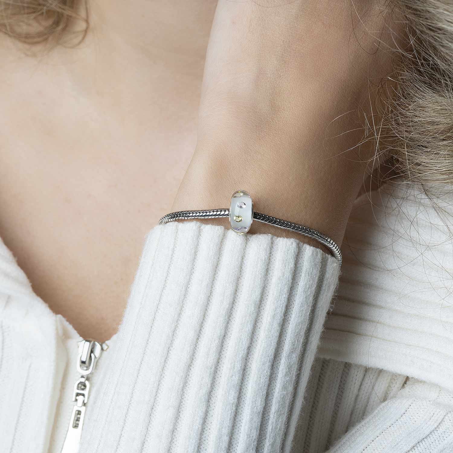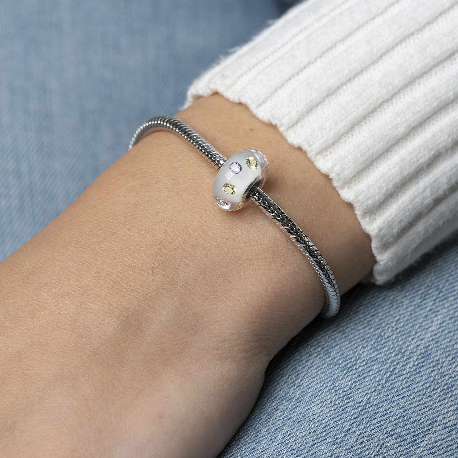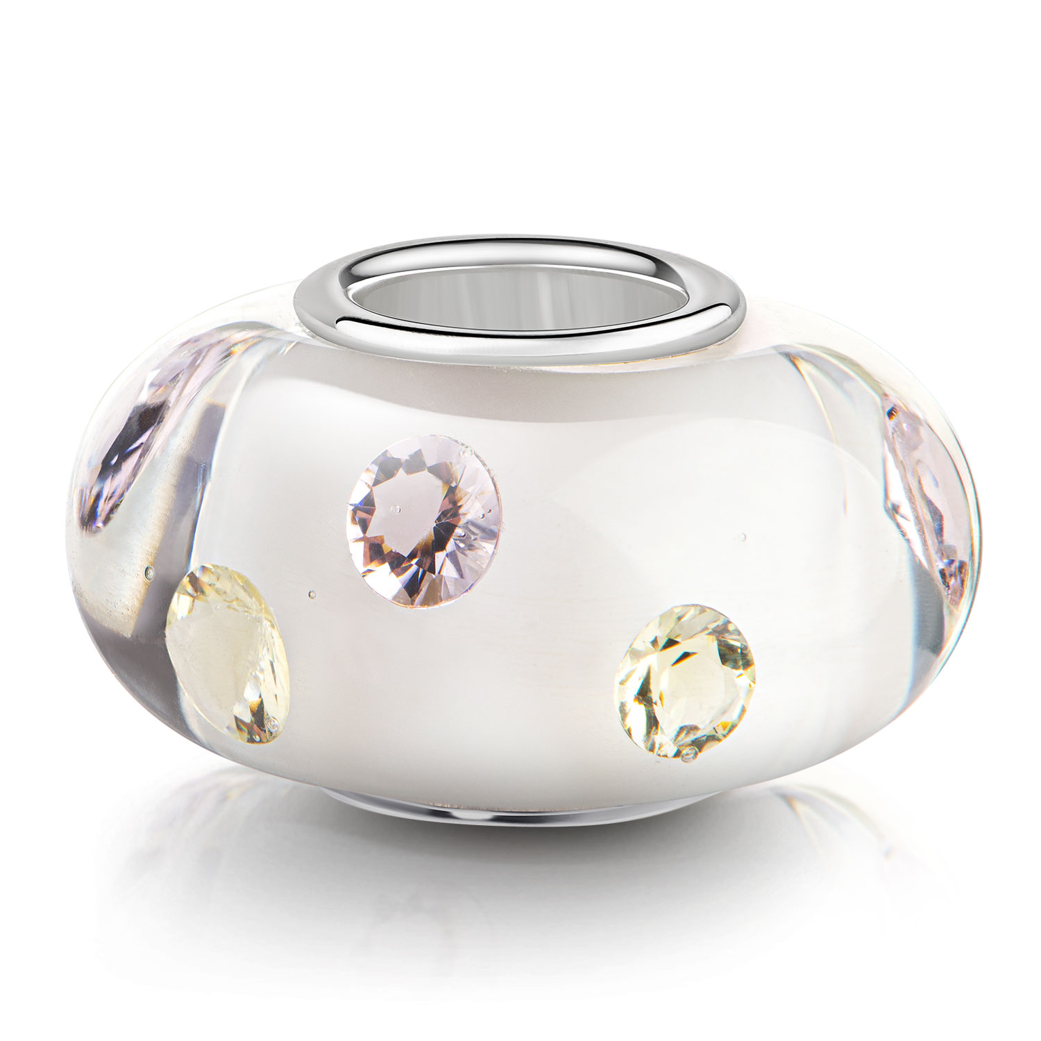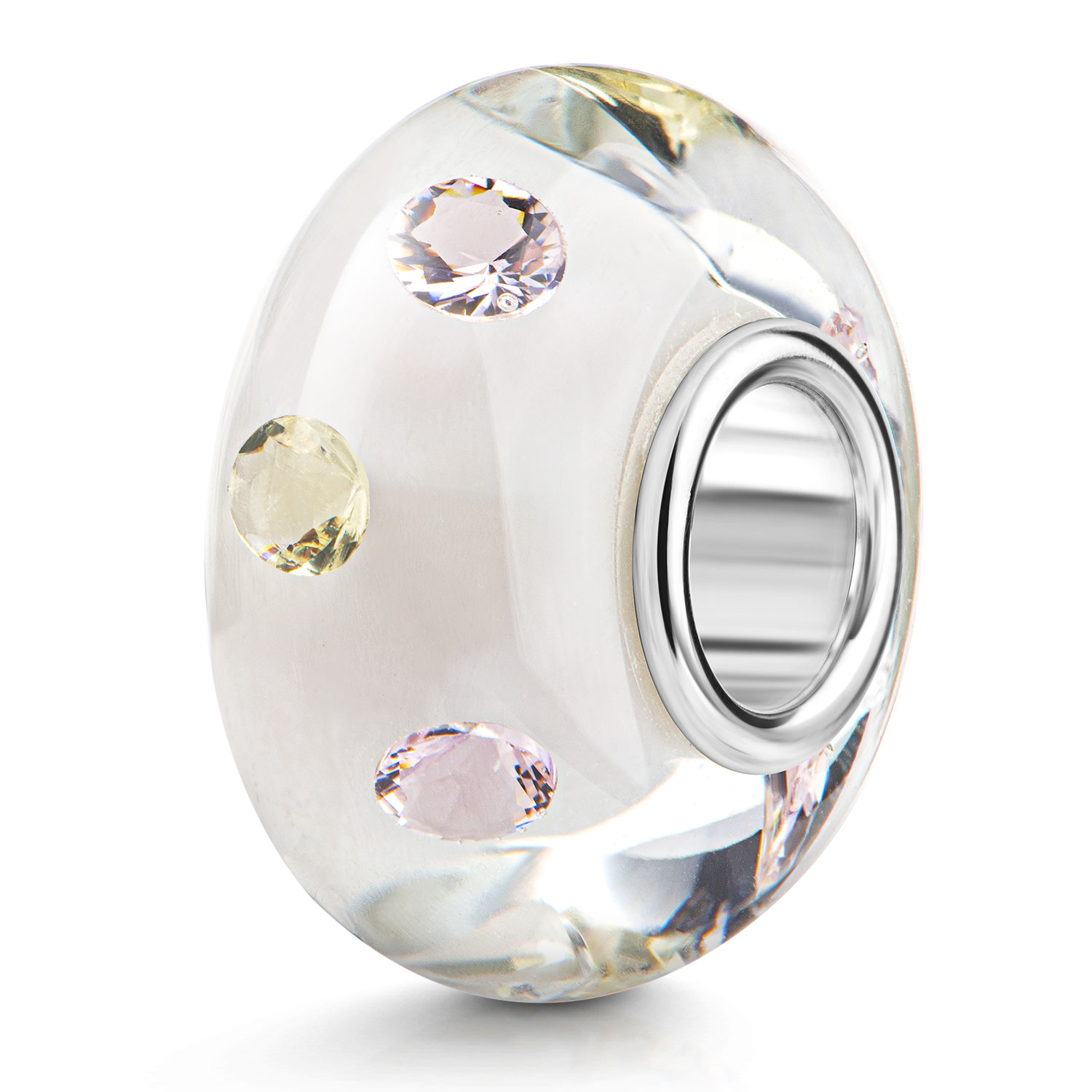 Weißer Glas Bead mit 8 eingearbeiteten Zirkonia in Rosa und Gelb im Glasinneren mit einer 925er Sterling Silber Hülse. Er ist passend für alle Beads Armbänder & Ketten mit max. 4,4mm Breite.