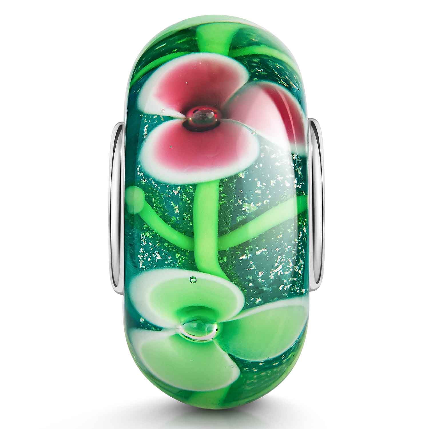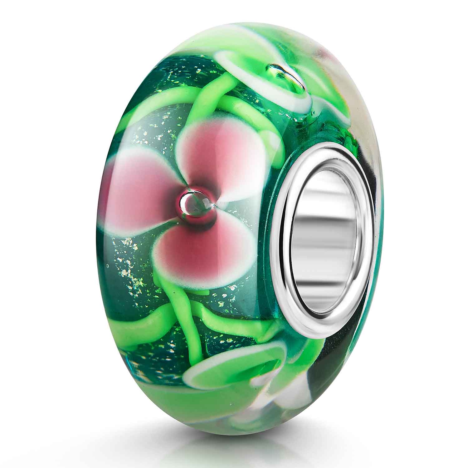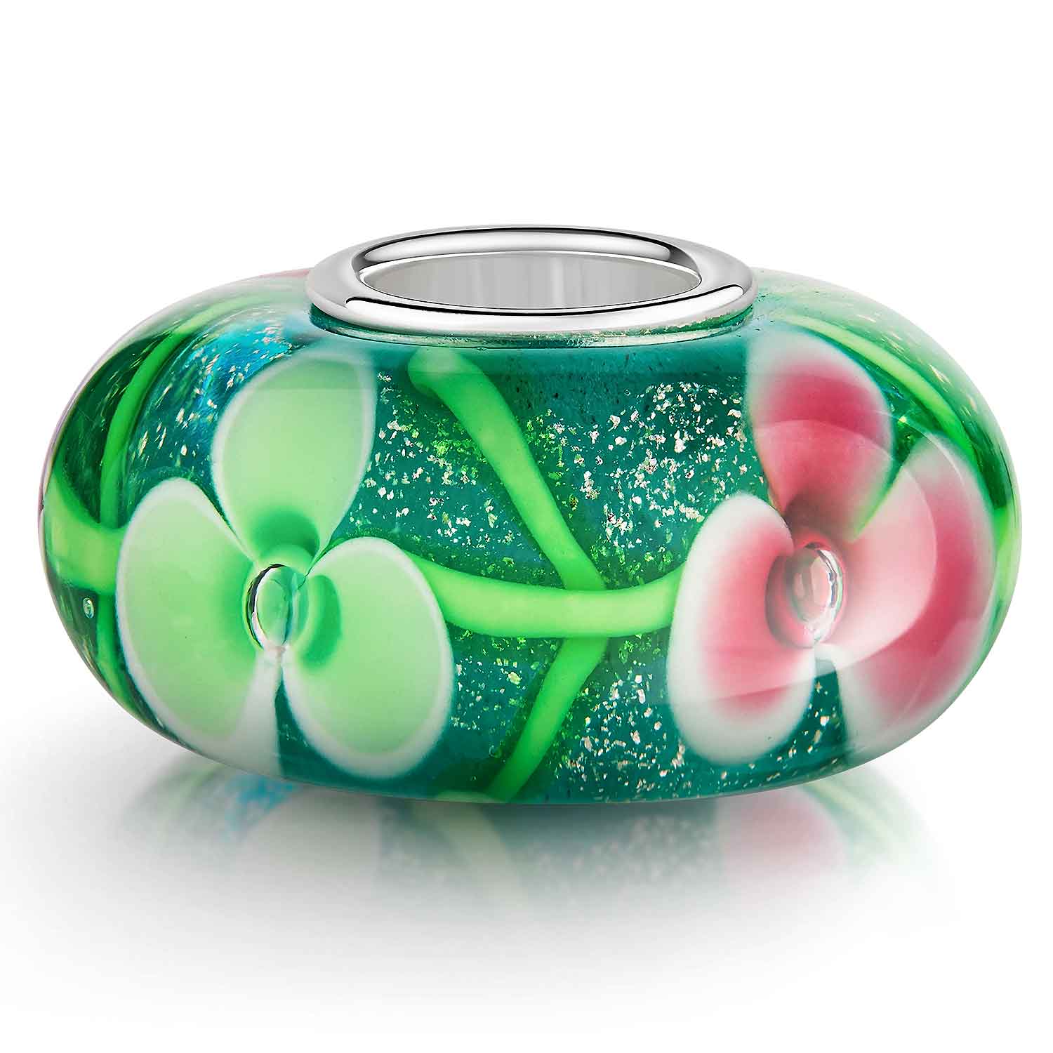 Glitzernder Glas Bead mit Blumen in Grün und Pink und Silberfolienstücken. Der Bead mit 925 Sterling Silber Hülse ist für Armbänder & Ketten bis max. 4,4mm Stärke geeignet.