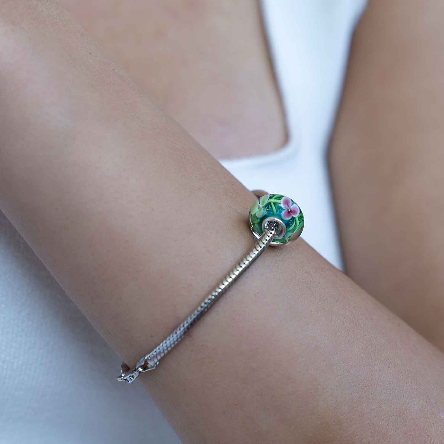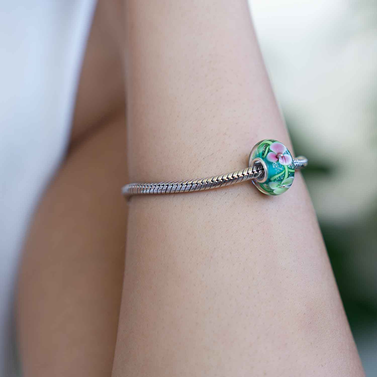 Dieser sommerliche Bead im Blumen Design ist aus Glas gefertigt und mit einer Hülse aus 925 Sterling Silber ausgestattet. Zahlreiche Blüten in Hellgrün und Pink schmücken diesen Bead und zusätzliche Glitzereffekte werden durch die eingearbeitete Silberfolie erzeugt. Der Bead passt auf alle gängigen Beads Armbänder und Ketten bis max. 4,4mm Stärke und ist somit kompatibel zu allen großen Marken.