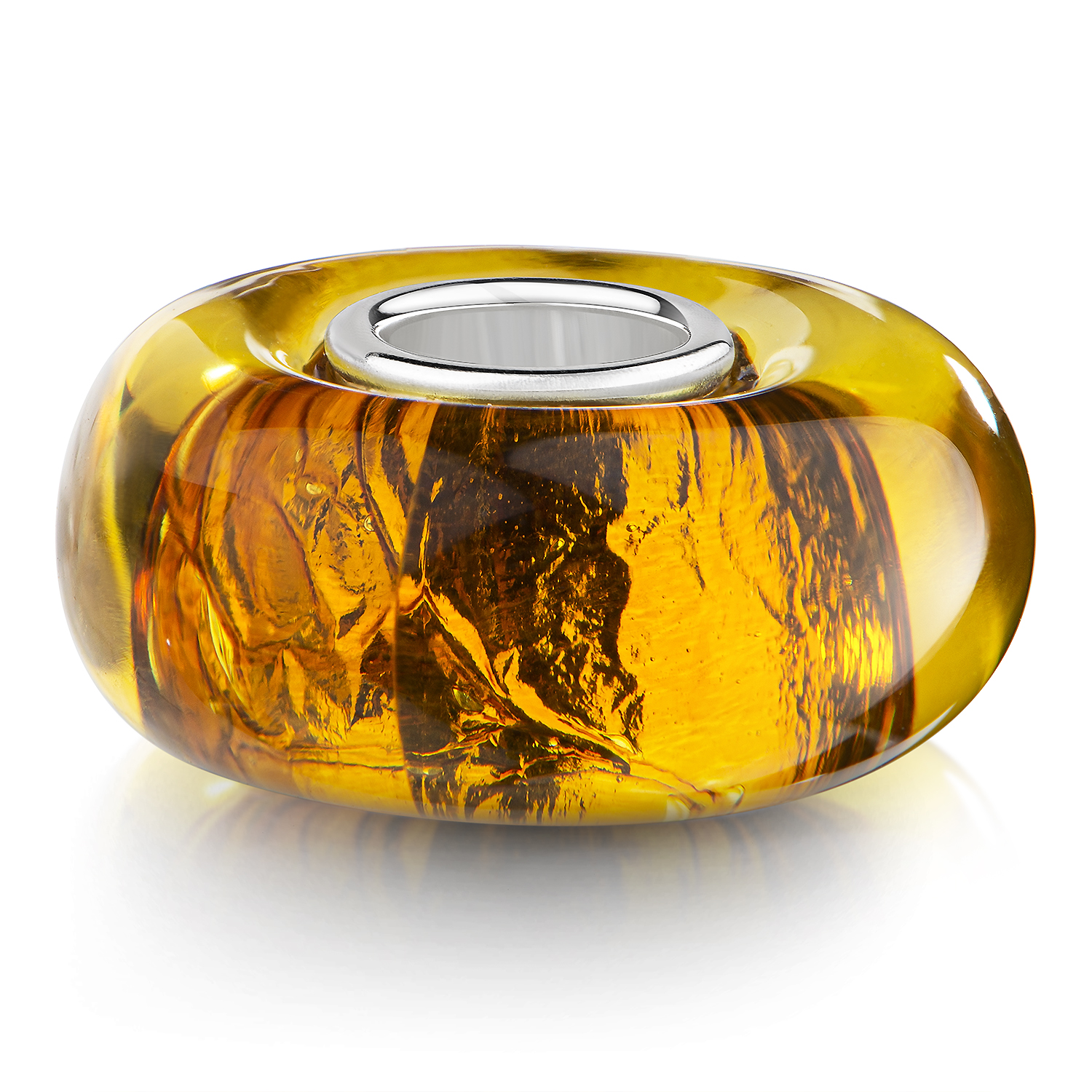 Schimmernder Glas Bead mit eingearbeiteter Glitzerfolie im gold / orange Farbton. Der Bead ist kompatibel mit Beads Armbändern und Ketten bis max. 4,4mm.
