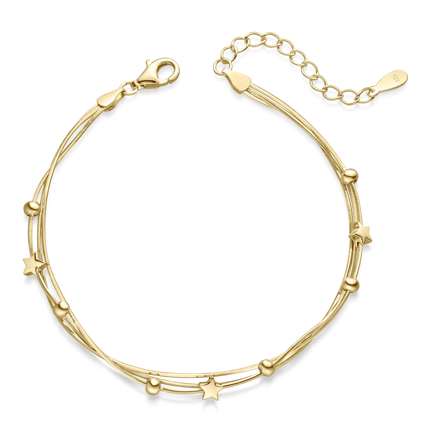 Filigranes 3-reihiges Armkettchen mit kleinen Kugeln und Sternen aus 925 Sterling Silber in Gold. Passend für jedes Handgelenk dank Verlängerungskette.