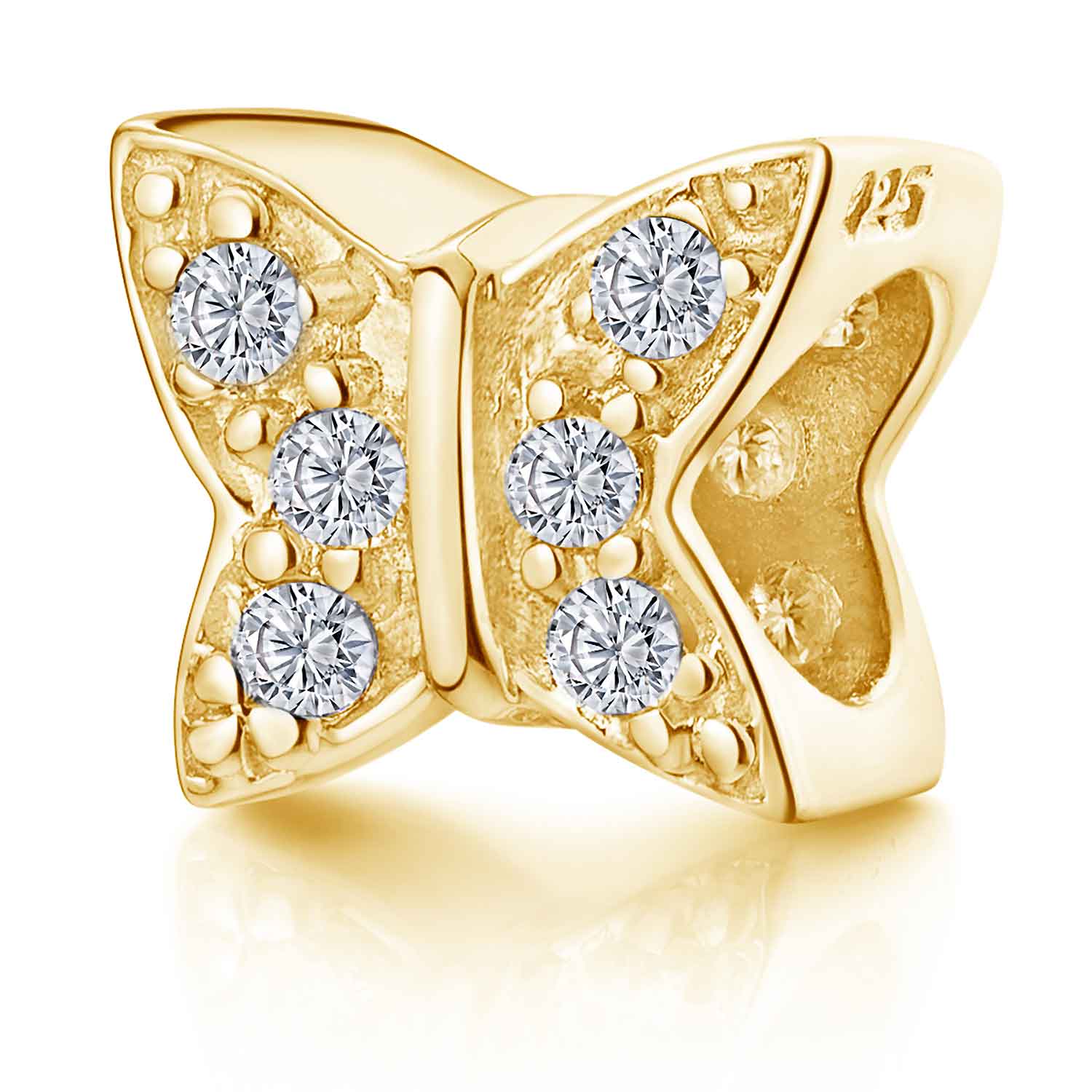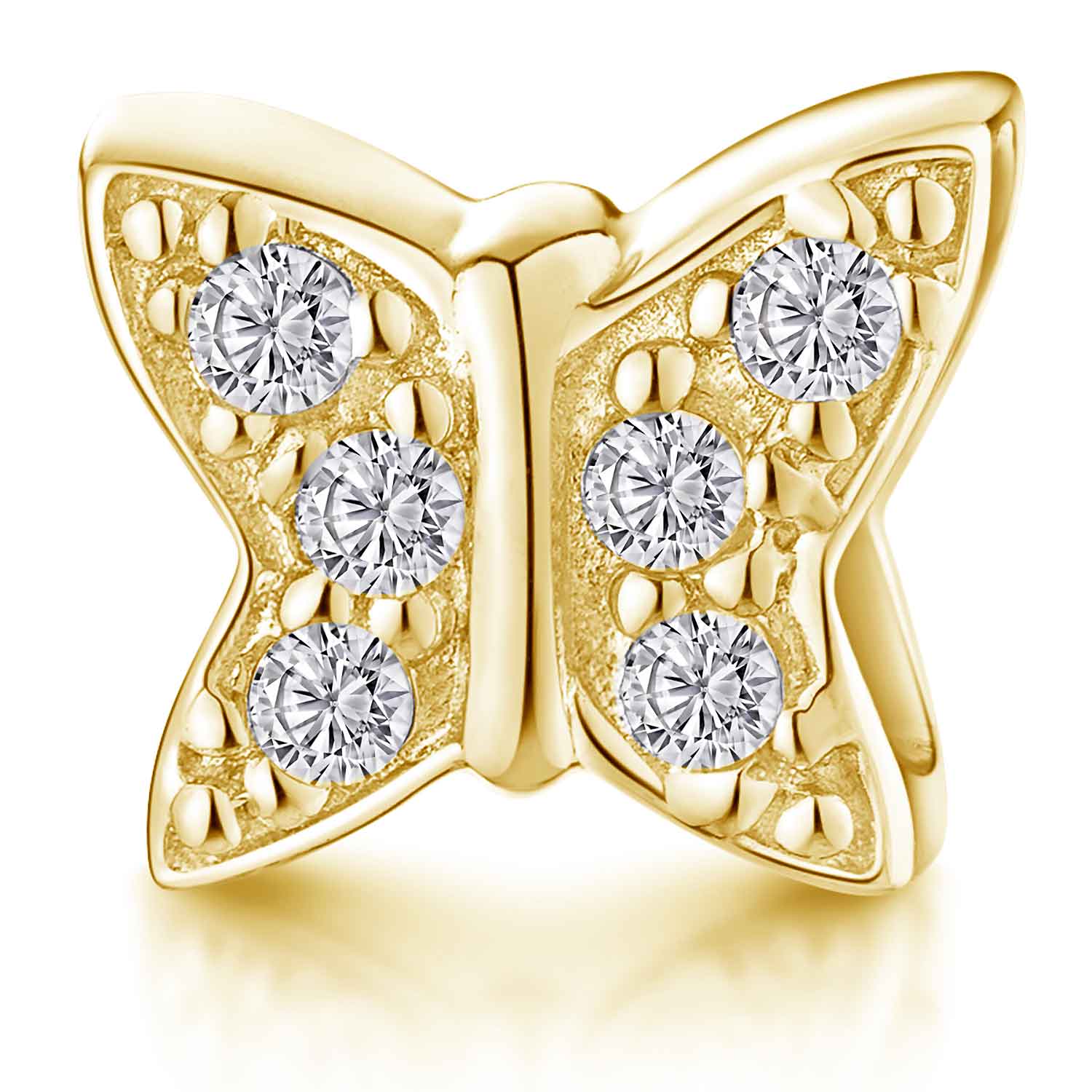 Silber Bead in Form eines Schmetterlings aus vergoldetem 925 Sterling Silber, besetzt mit weißen Zirkonia Steinen.