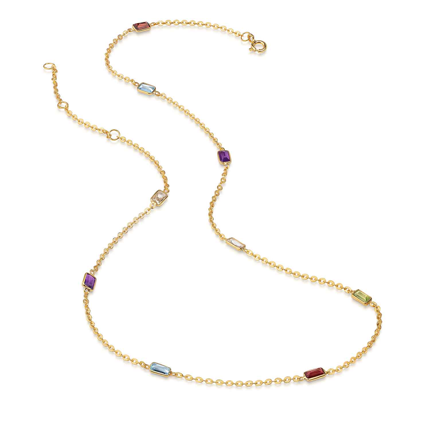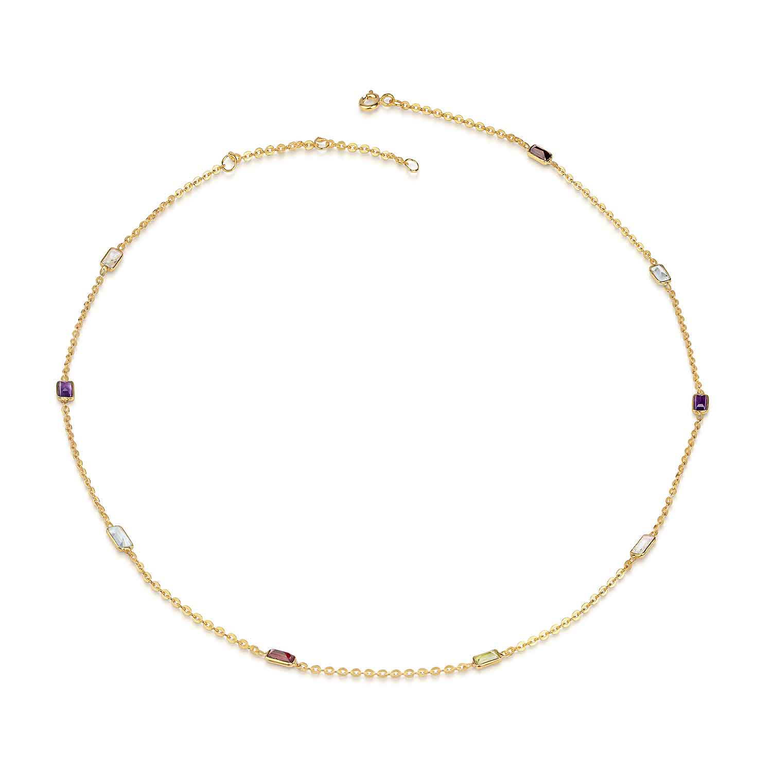 Unser goldenes Collier wird durch die filigrane Verarbeitung und die bunten Edelsteine zu einem tollen Hingucker. Die Damenkette wurde aus vergoldetem 925er Sterling Silber gearbeitet und ist mit 9 rechteckigen Steinen besetzt: Peridot, Granat, Zirkonia, Blautopas und Amethyst. Die Länge der Kette lässt sich in 3 Stufen von 41 bis 46cm einstellen.