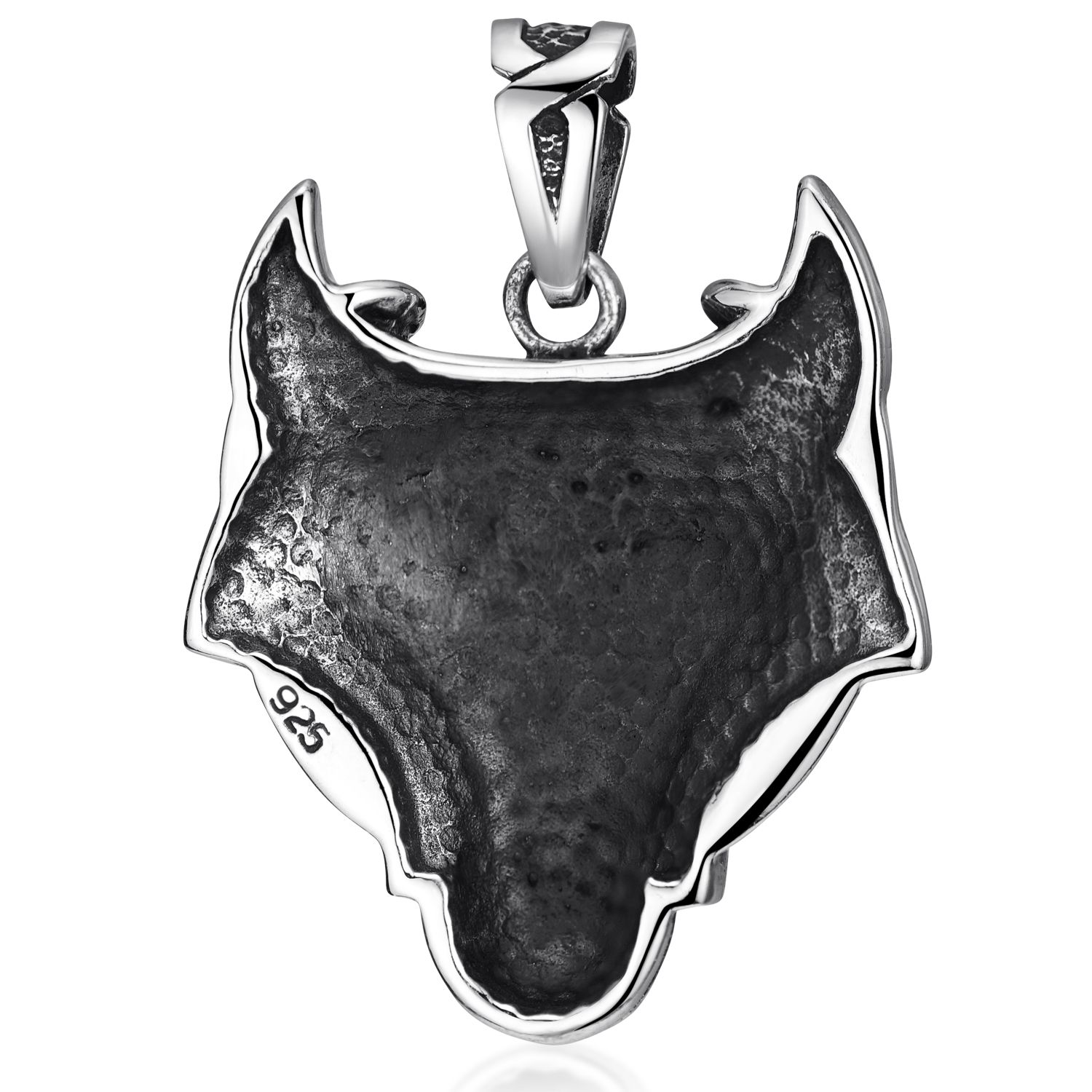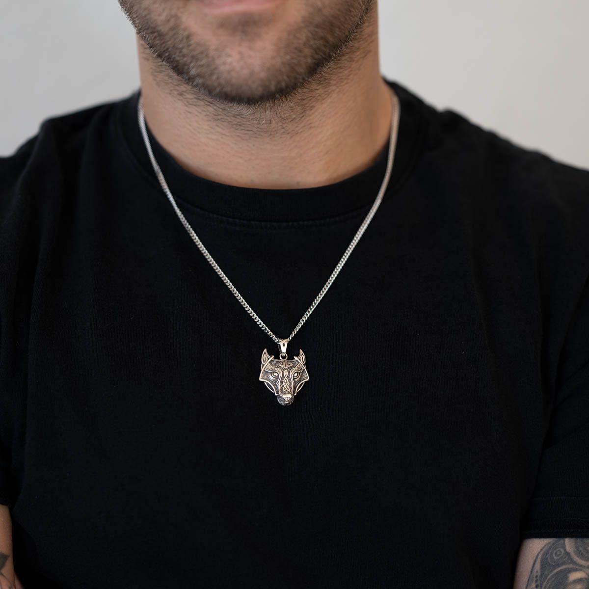 Massiver Anhänger für Herren mit Wolfskopf im keltischen Stil. Der Kettenanhänger ist aus 925 Sterling Silber detailliert gearbeitet und teilweise geschwärzt.