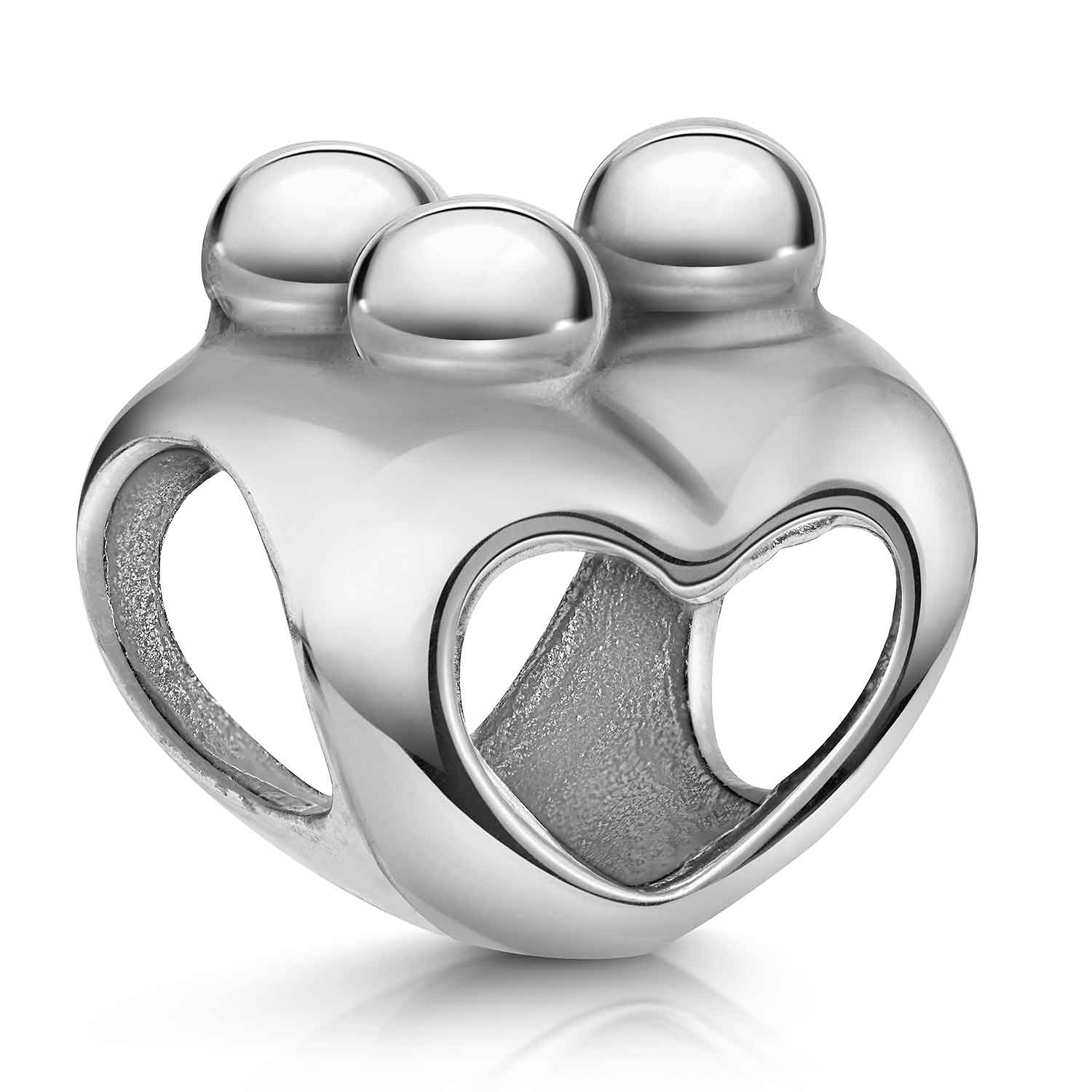 Dieser reine 925 Sterling Silber Bead in hochwertiger Ausführung zeigt eine Mutter mit zwei Babies / Kindern auf einem beidseitigem Herzmotiv. Der Silber Bead ist passend zu allen gängigen Bead Armbändern bis max. 4,4mm Stärke und somit kompatibel zu fast allen Beads Armbändern bekannter Marken / Hersteller.