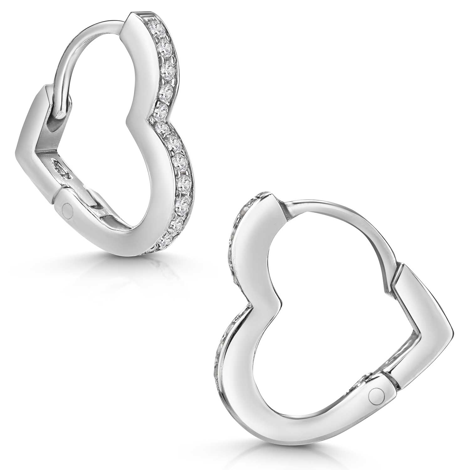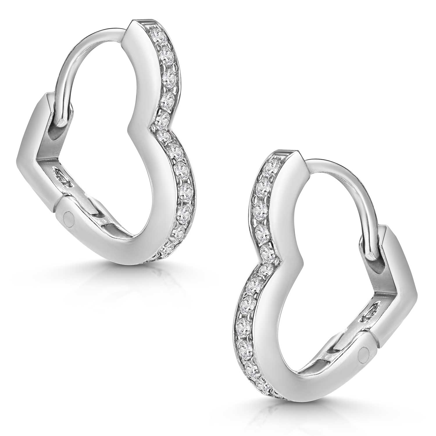 Zierliche Herz Creolen aus 925 Silber mit jeweils 15 weißen Zirkonia-Steinen und Klappverschluss.