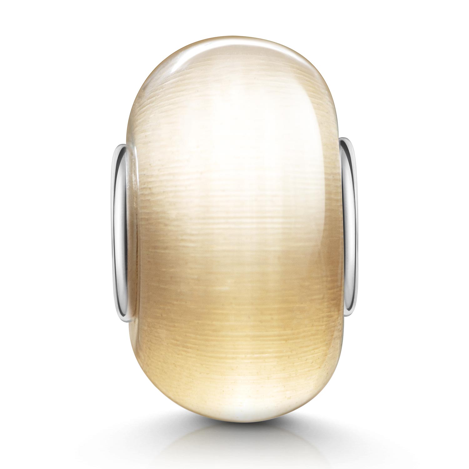 Dieser schöne Glas Bead schimmert in einem beigen Farbton und wurde in Katzenauge-Optik gefertigt. Die Glasperle ist mit einer massiven Hülse aus 925 Sterling Silber ausgestattet und ist passend zu allen gängigen Beads Armbändern und Ketten bis max. 4,2mm Breite.