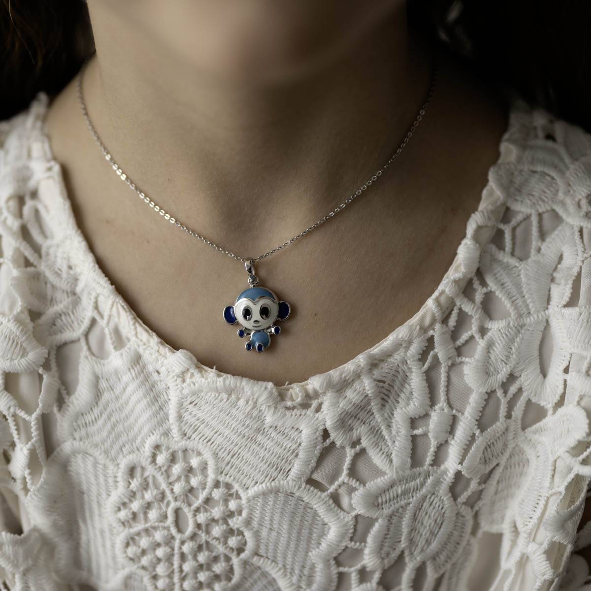 Für Jungen und Mädchen gleichmaßen geeignet ist unser niedlicher Kettenanhänger in Form eines Äffchens. Der Anhänger wurde aus 925 Sterling Silber gefertigt und die Emaille in Blau, Weiß und Türkis setzt einen tollen farbigen Akzent. Sie können den Kinder Schmuckanhänger bei uns in einem Set mit einer längenverstellbaren Kinderkette in 36 bis 40cm Länge bestellen oder mit anderen Ketten bis zu einem Durchmesser von max. 4,2mm kombinieren.