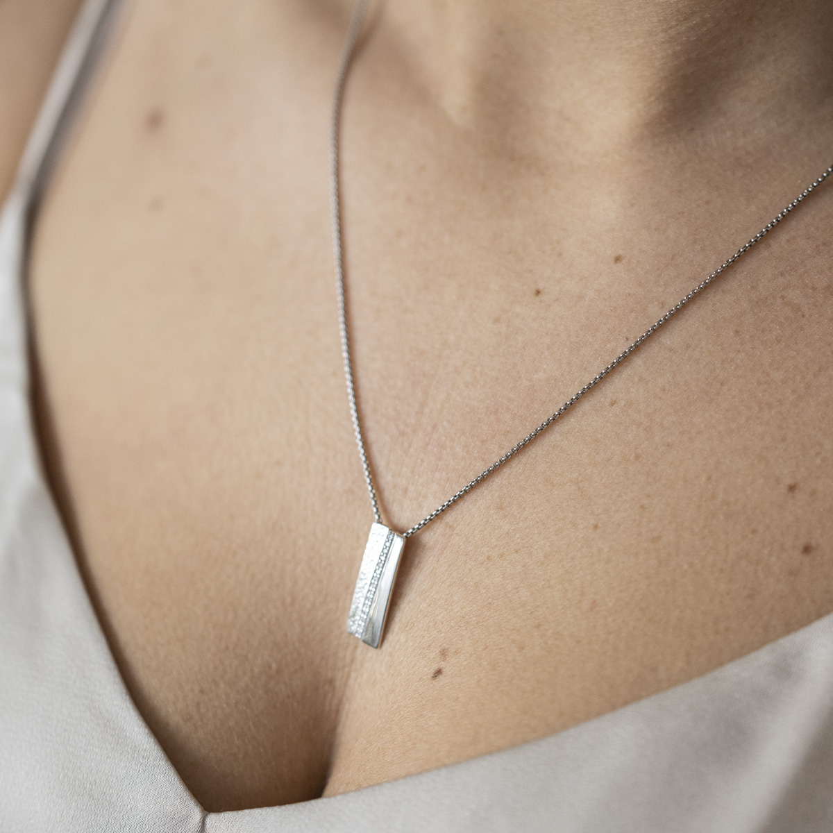 Unser länglicher Kettenanhänger besticht durch seine unterschiedlichen Oberflächen - glänzend und gehämmert. Die mittig angeordneten zahlreichen Zirkonia Steinchen verleihen ihm zudem ein zartes Funkeln. Gefertigt aus 925 Sterling Silber schützt eine zusätzliche Beschichtung aus Rhodium das Schmuckstück vor einem vorzeitigem Anlaufen. Der Anhänger ist passend für alle Ketten bis zu einer max. Stärke von 1,8mm und bei uns auch im Set mit einer edlen Venezianerkette erhältlich.