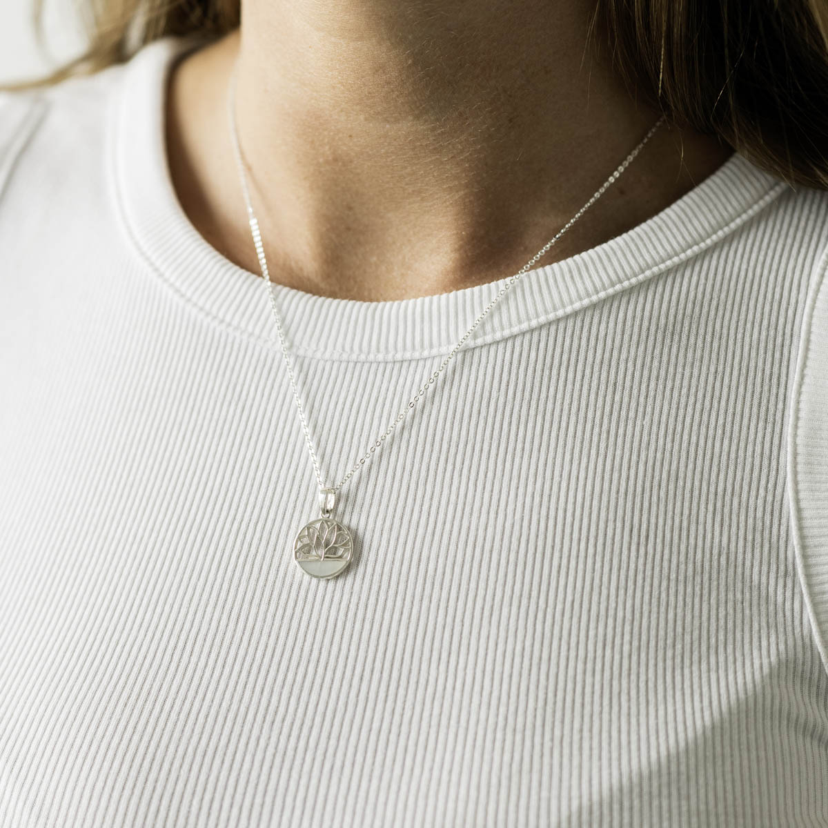 Runder Kettenanhänger mit Lotusblüte Motiv und weißem Perlmutt aus 925 Sterling Silber.
