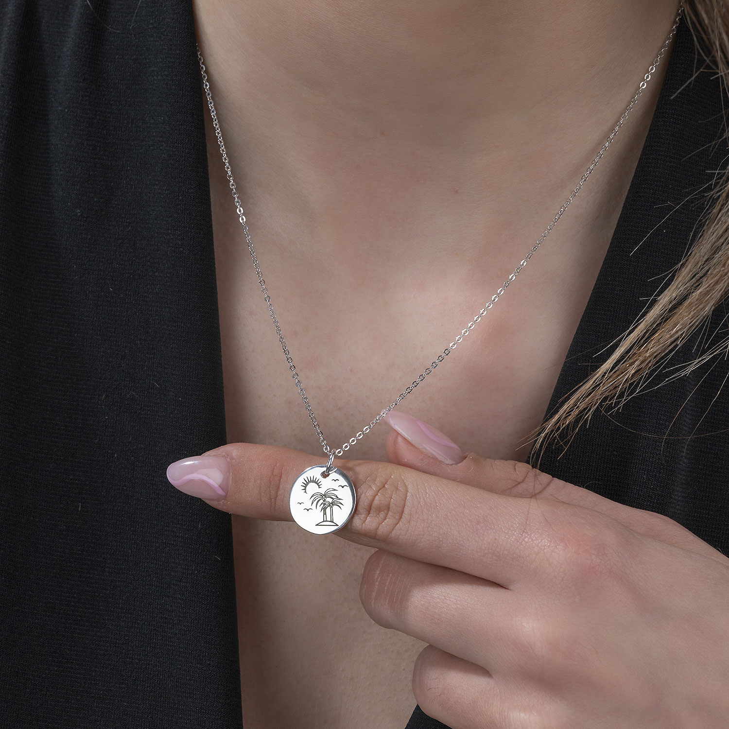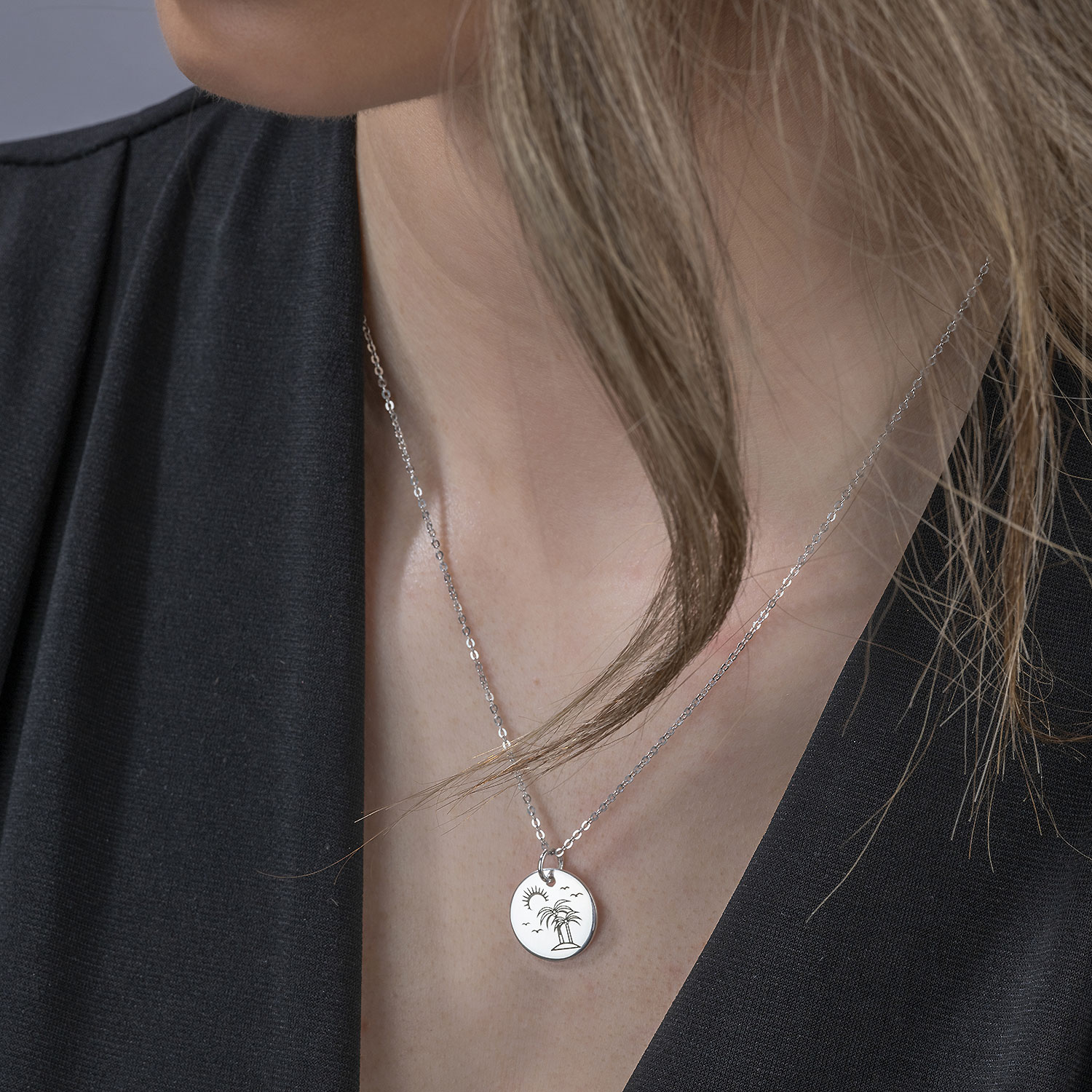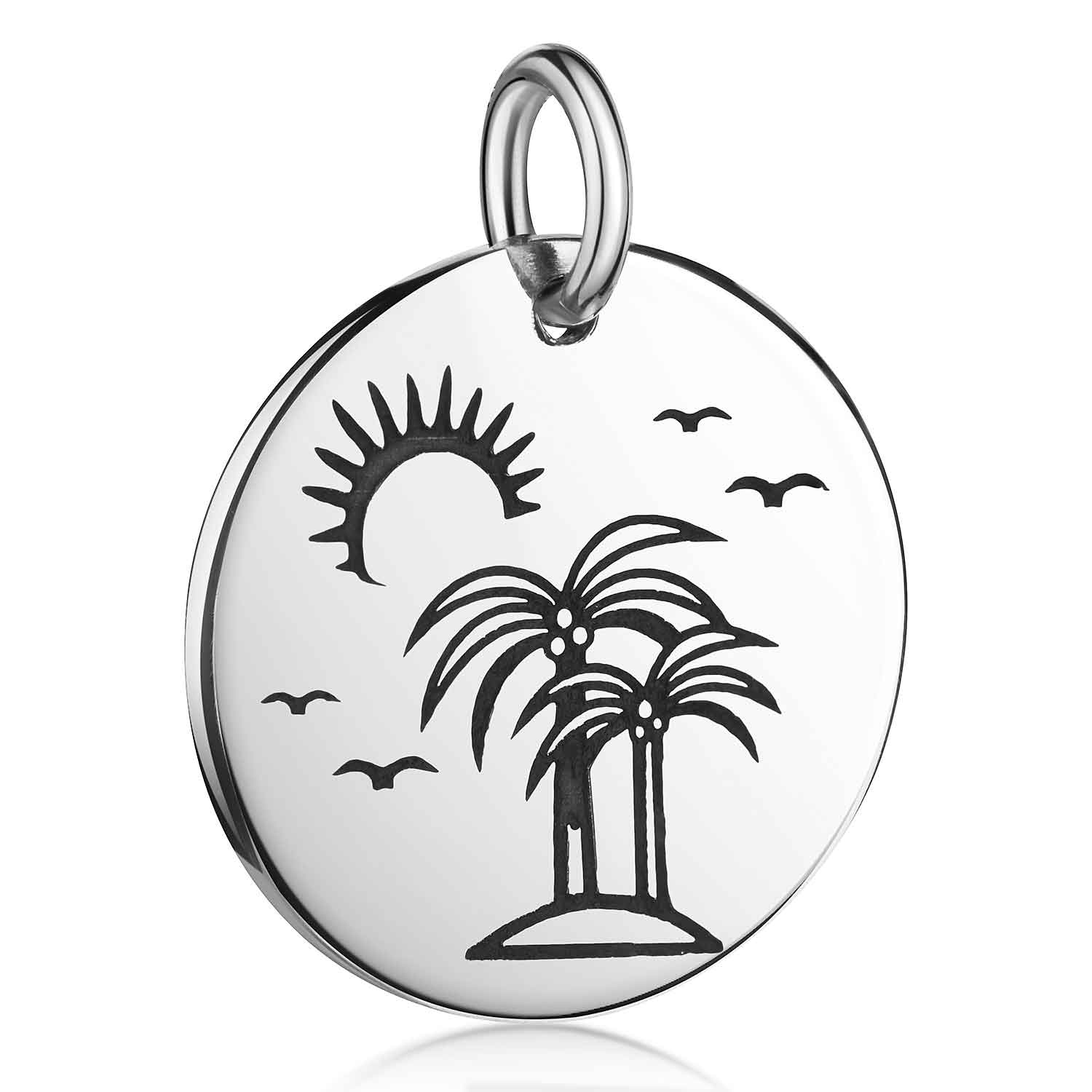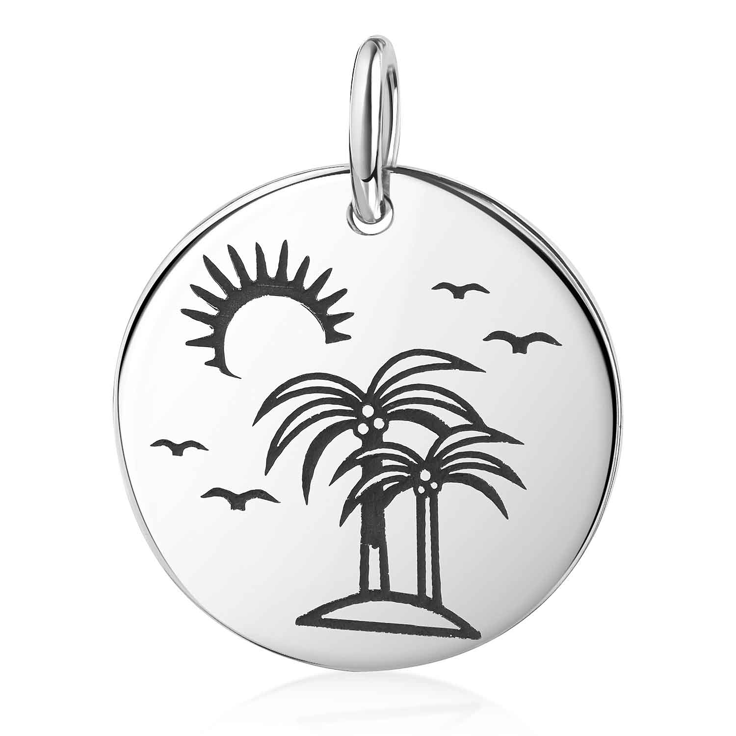 Unser runder Palmen Anhänger erinnert an einen entspannenden Urlaub in der Südsee. Auf der Vorderseite sind Palmen auf einer Insel zu sehen, welche von einer Sonne sowie fliegenden Möwen umgeben sind. Der Kettenanhänger wurde aus 925 Sterling Silber gefertigt und ist passend für alle Ketten bis zu einer maximalen Stärke von 2,4mm. Wahlweise ist der Schmuckanhänger im Set mit einer längenverstellbaren Ankerkette in 42 bis 47cm Länge erhältlich.
