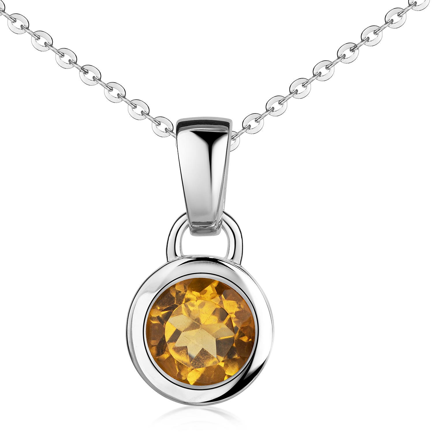 Runder Damen Kettenanhänger mit echtem Citrin Edelstein. Der Anhänger wurde aus rhodiniertem 925 Sterling Silber gefertigt und ist wahlweise mit einer passenden Ankerkette im Set erhältlich.