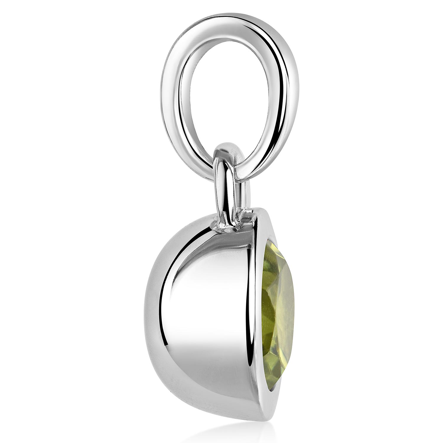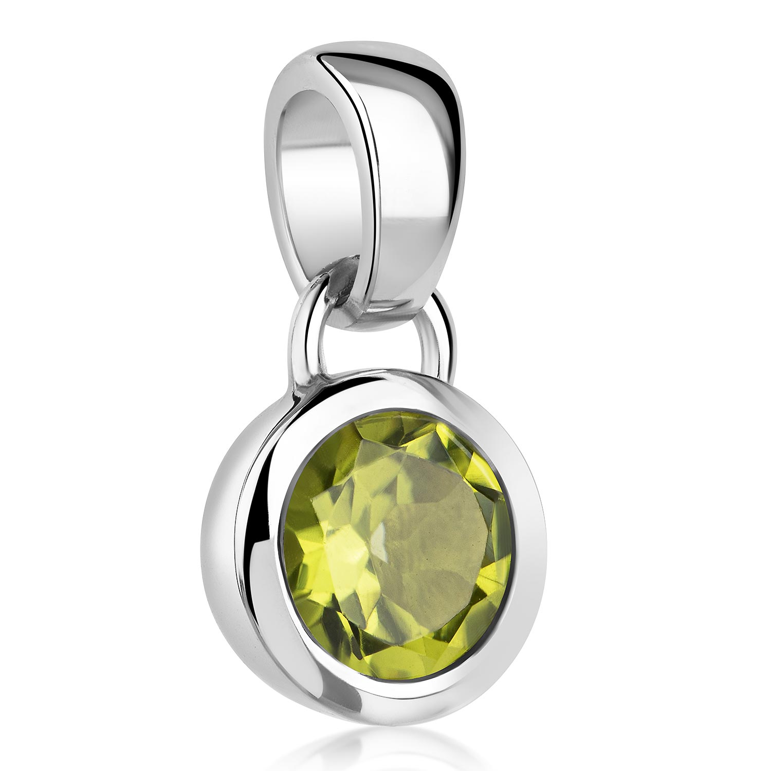 Runder Damen Kettenanhänger mit echtem Peridot Edelstein. Der Anhänger wurde aus rhodiniertem 925 Sterling Silber gefertigt und ist wahlweise mit einer passenden Ankerkette im Set erhältlich.