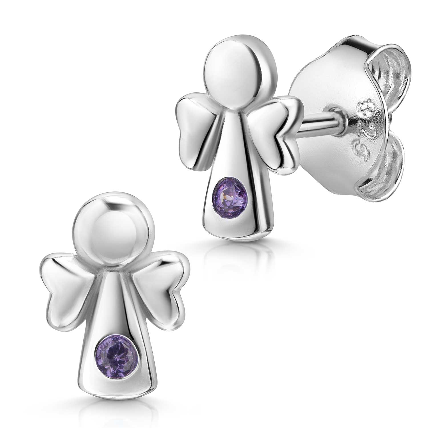 Symbolträchtige Kinder Ohrringe in Form eines Schutzengels aus rhodiniertem 925 Sterling Silber mit je einem lila Zirkonia Stein.