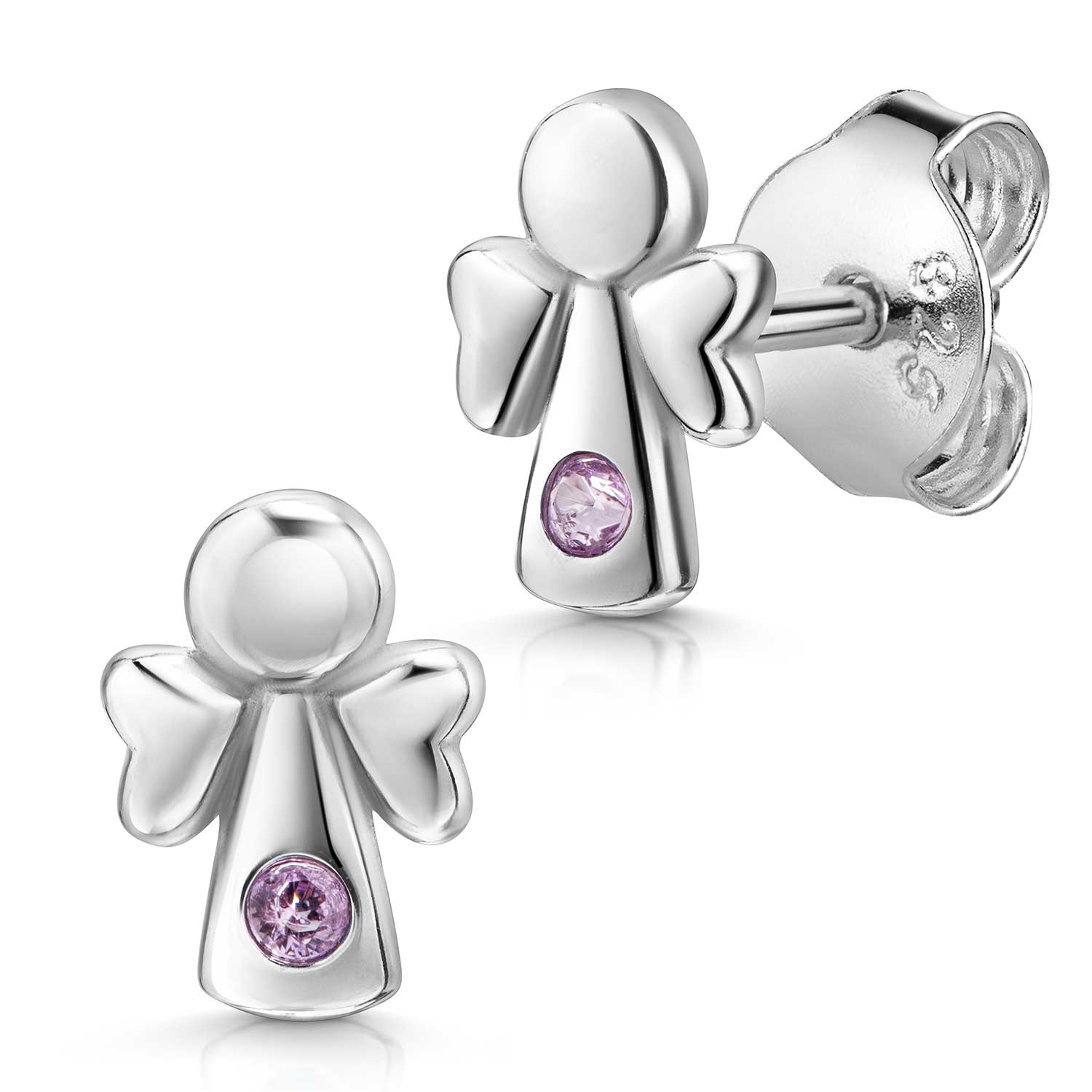 Symbolträchtige Kinder Ohrringe in Form eines Schutzengels aus rhodiniertem 925 Sterling Silber mit je einem rosa Zirkonia Stein.
