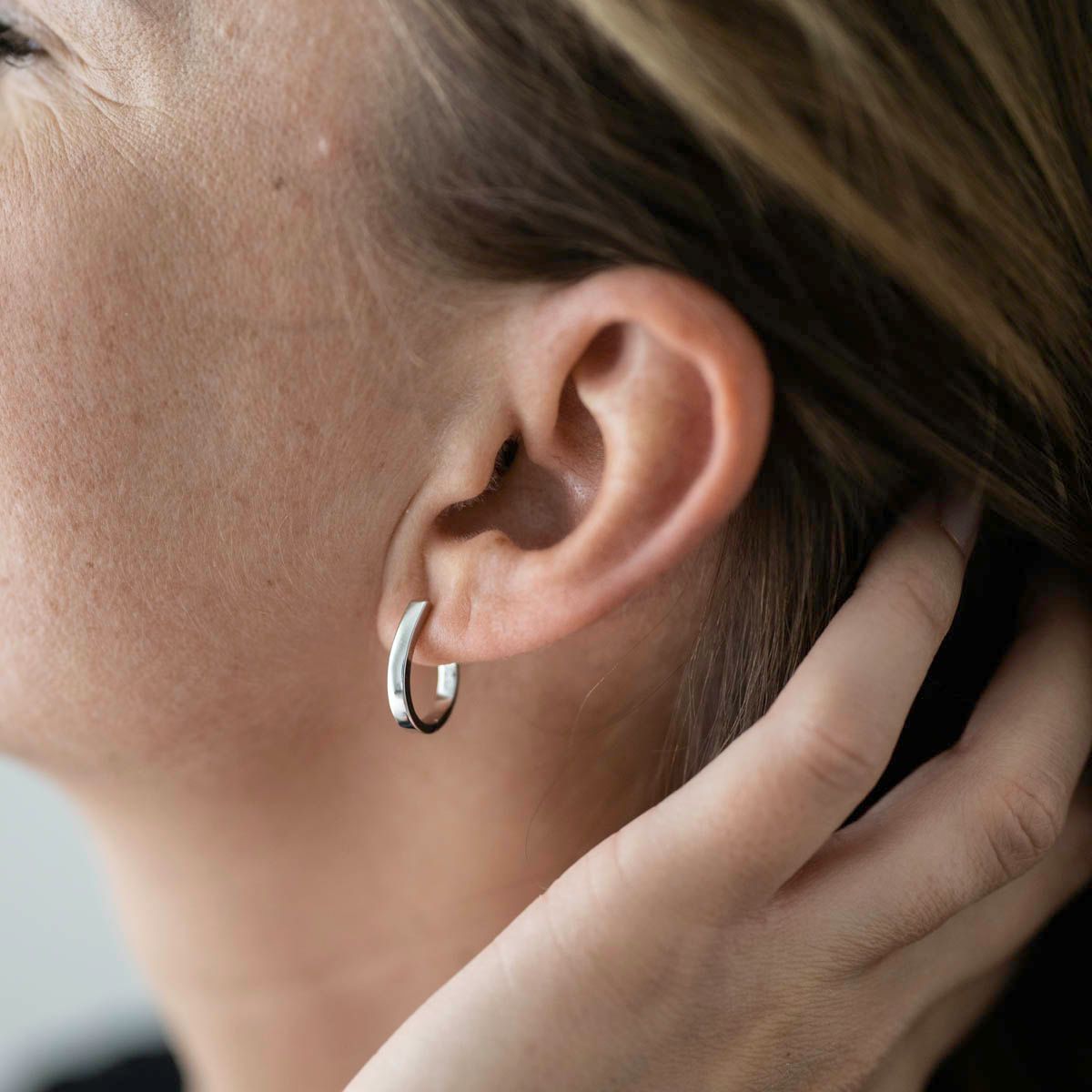 Unsere ovalen Creolen in leicht gebogener Form sind dank der Klappmechanik, spielend leicht An- und Abzulegen. Die Klappcreolen wurden aus 925 Sterling Silber gefertigt und mit einer hochwertigen Rhodiumschicht überzogen.