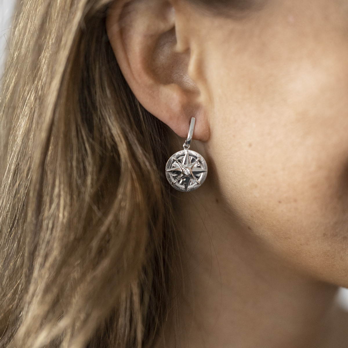 Runde Kompass Ohrstecker aus reinem 925 Sterling Silber. Jeder Ohrring ist zudem mit einem weißen Zirkonia Stein verziert und wurde mit einem Anlaufschutz aus Rhodium versehen.