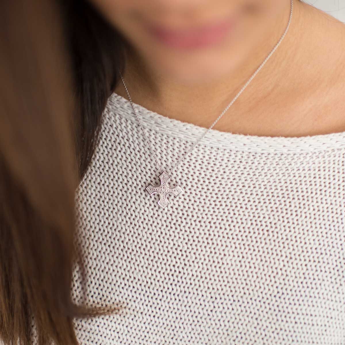 Der filigrane Anhänger stellt einen Tolosanerkreuz dar. Dieser Kreuz aus der französischen Heraldik hat gleich lange Kreuzarme mit je drei Spitzen. Kleine weiße Zirkonia Steine zieren das Schmuckstück und sorgen für zusätzlichen Glanz. Der Anhänger wurde aus 925 Sterling Silber gearbeitet und zum Anlaufschutz rhodiniert.