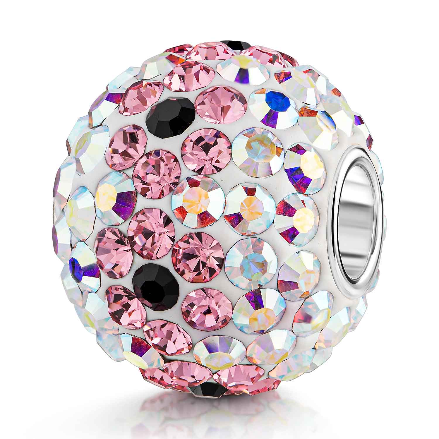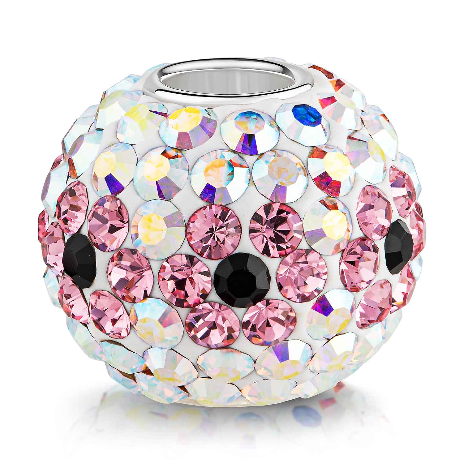 XXL Bead mit zahlreichen Strasssteinen / Kristallen in Rosa / Weiß und einer Hülse aus massivem 925 Sterling Silber. Die funkelnden Steinchen bilden wunderschöne Kristall Blumen auf der Oberfläche des Beads. Der Kettenanhänger ist passend zu allen Beads Ketten mit einer max. Breite von 4,4mm.
