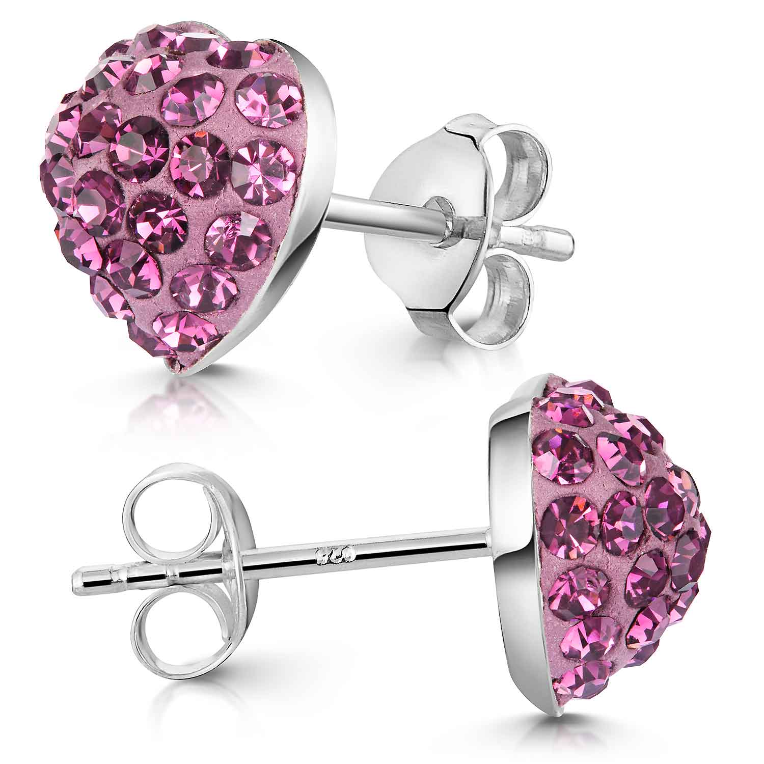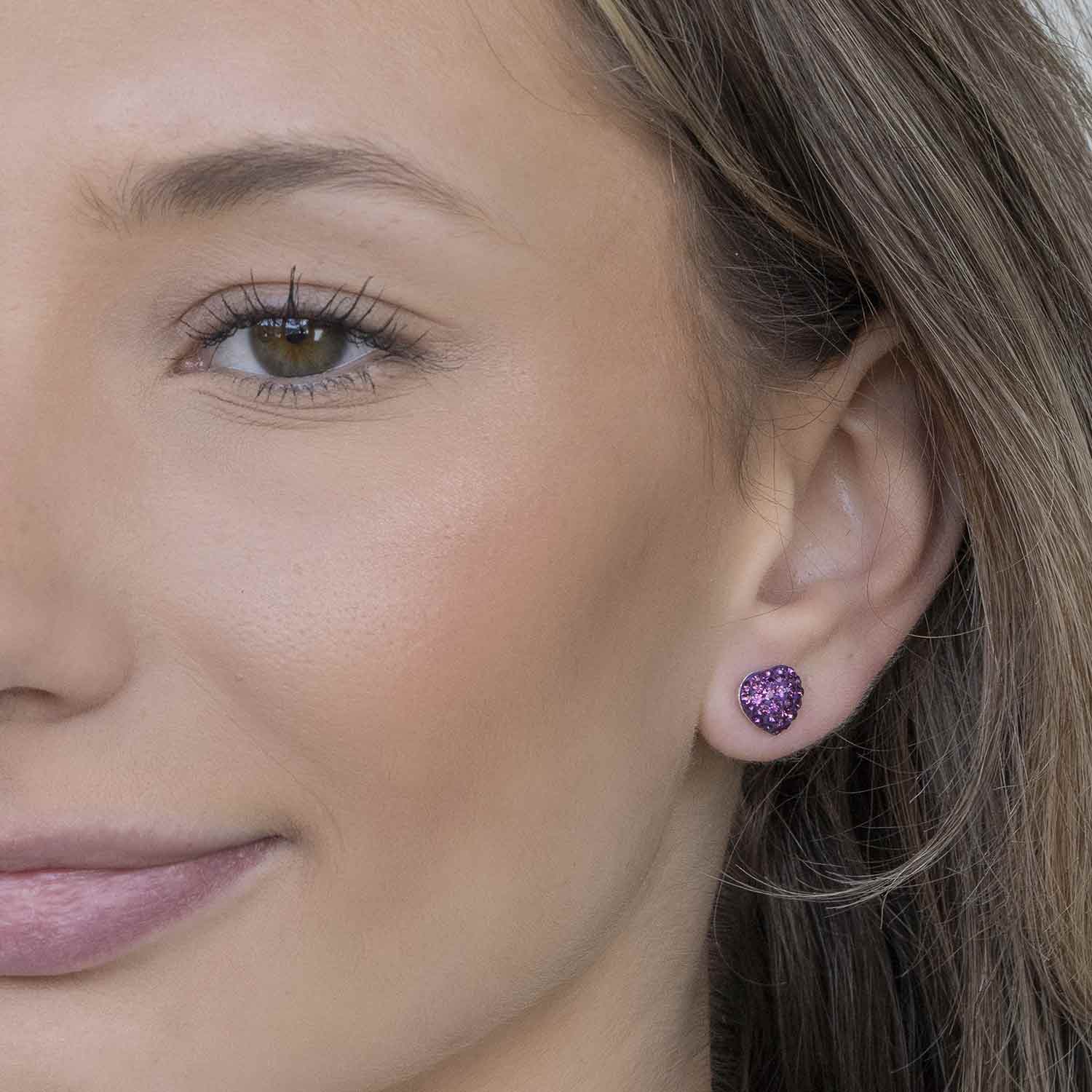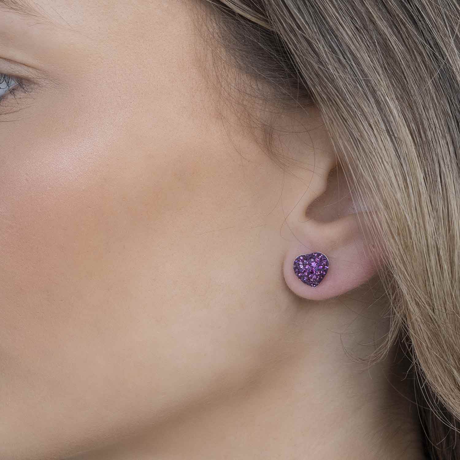 Die Silber Ohrringe sind vollständig mit lila facettierten Kristallsteinen bestückt, die ihnen schönes Glitzern schenken. Durch ihr geringes Gewicht sind sie sehr angenehm im Tragekomfort.