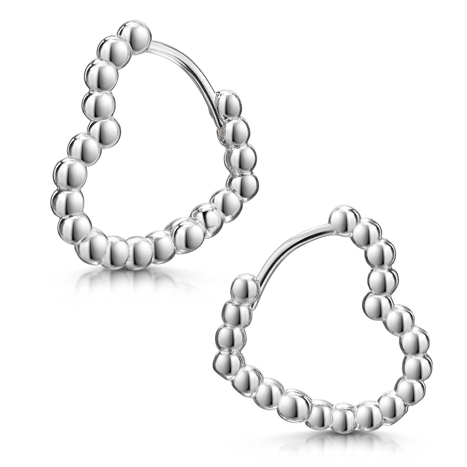 Romantische Kugel Creolen in Herzform aus hochglanzpoliertem 925 Sterling Silber mit Klappverschluss.