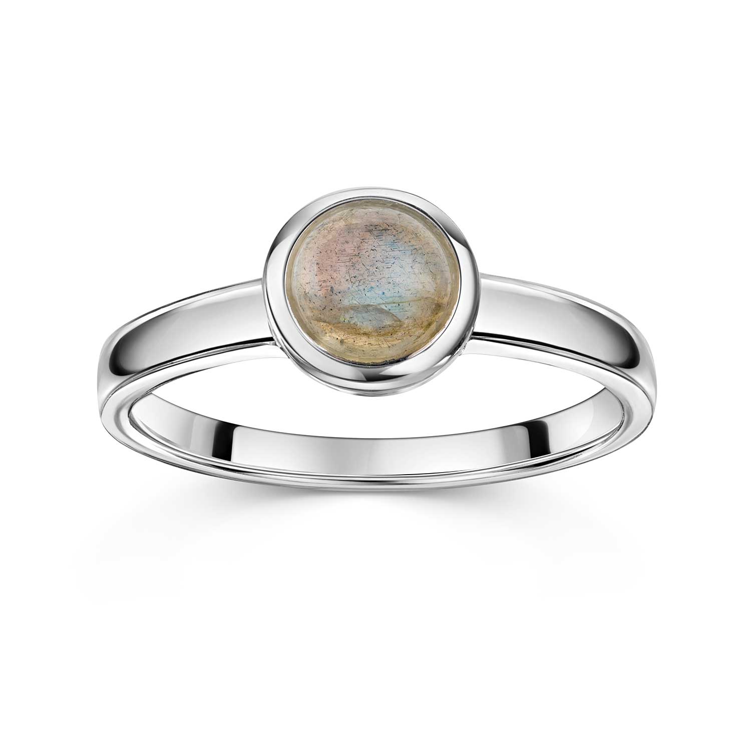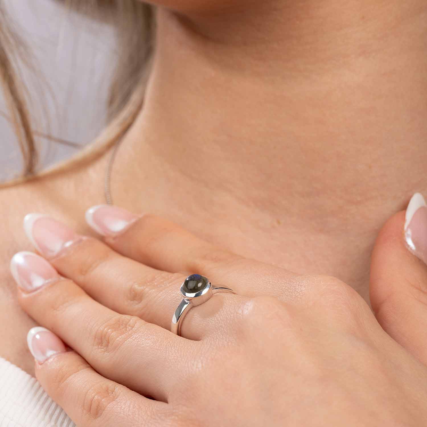 Für einen eleganten und doch dezenten Look sorgt unser runder Ring aus 925 Sterling Silber, der mittig mit einem Labradorit im Cabochon-Schliff geschmückt ist. Der Edelstein Ring passt sowohl zur Alltags-, als auch zur Abendgarderobe.
